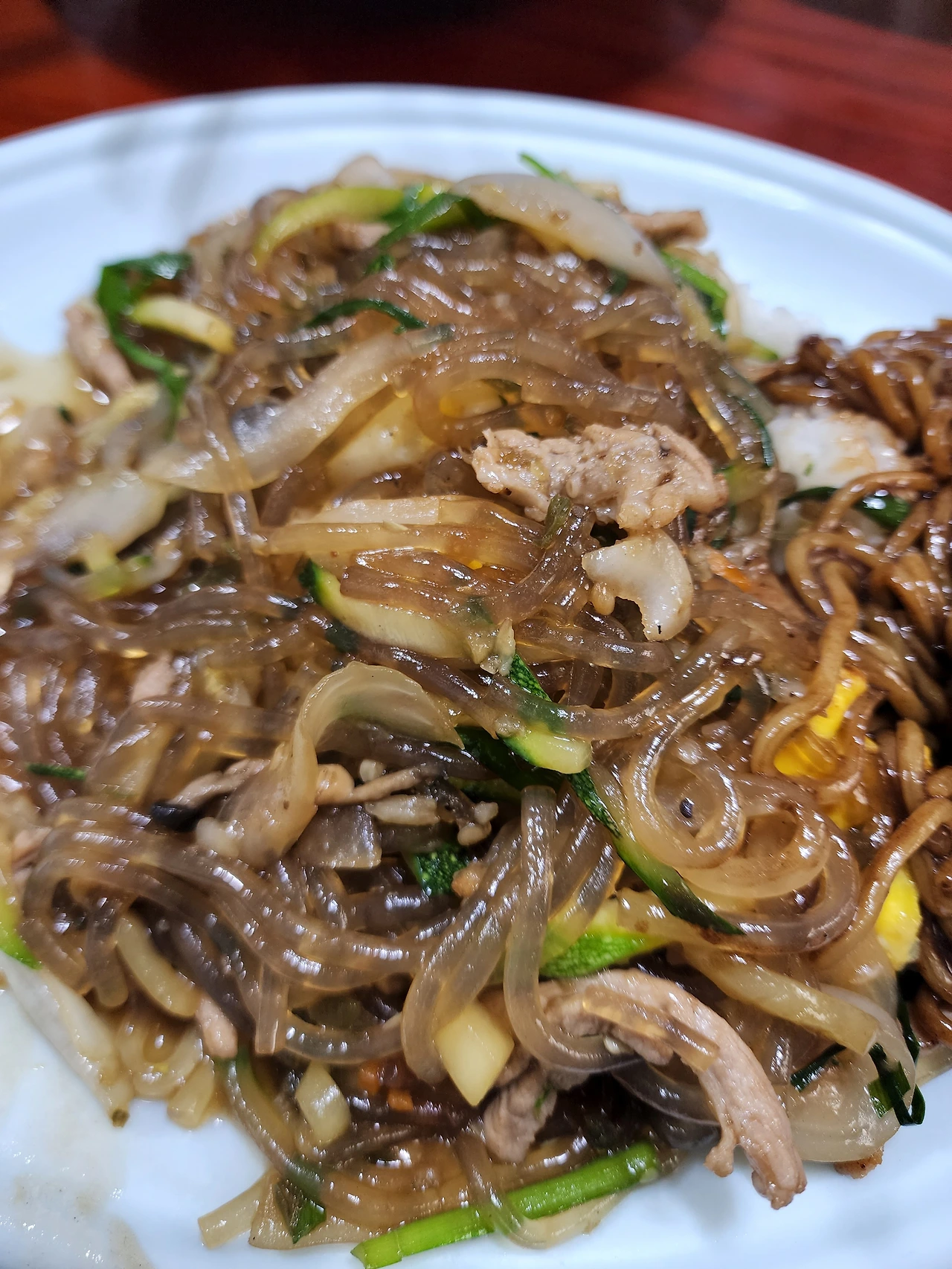 겉으로 보아도 살짝살짝 강하게 익은 야채들의 색깔과 냄새, 그리고 살짝 탱글 거리기도 탄탄하게도 느껴지는 당면, 당면은 집에서 곧잘 먹는 얇은 당면이 아니라 그것보다는 2배 정도 굵은, 상당히 굵은 당면이었다. 거기에 채썰린 애호박, 당근, 양파, 버섯, 짭짤하게 타오른 간장과 화끈거리는 후추의 향미 두텁게 쌓아져 올린 당면과 밥의 언덕. 마지막은 웍으로 강하게 익혀낸 반숙 혹은 완숙 달걀.