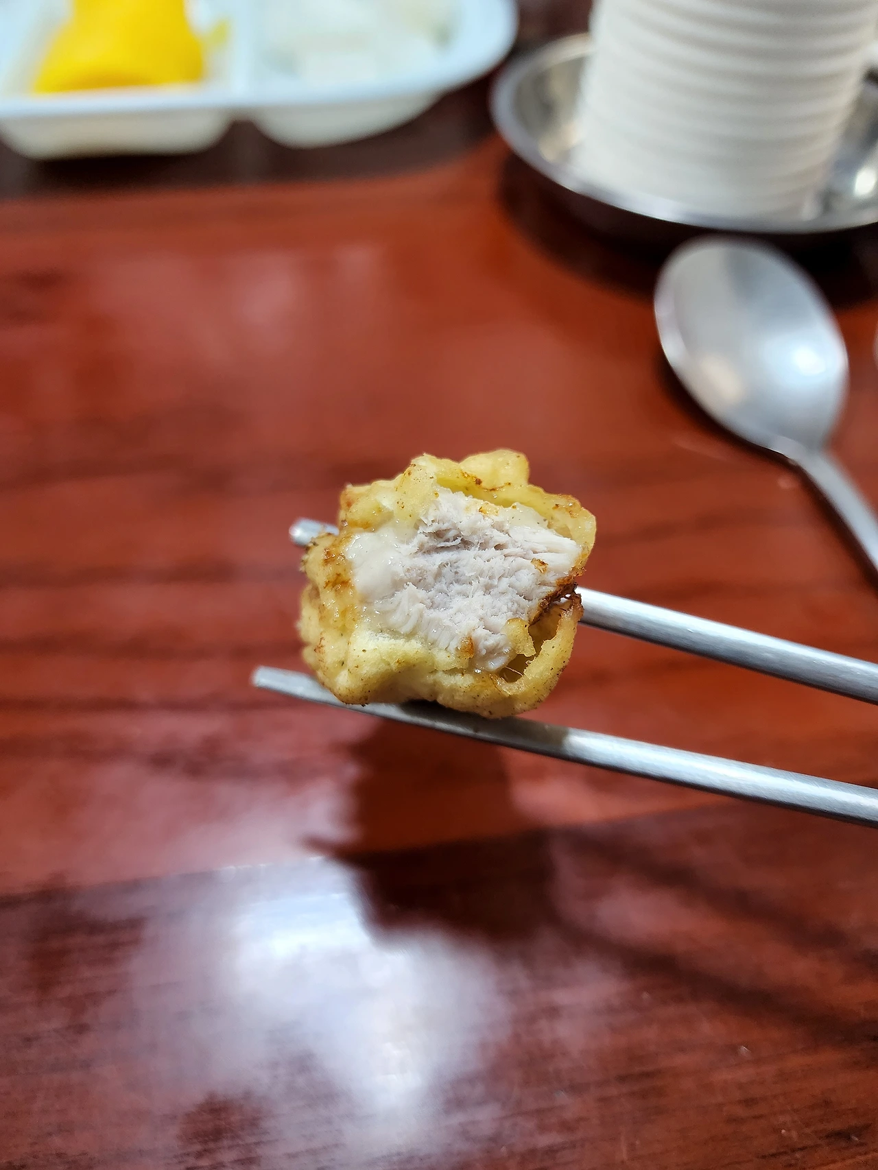 "옛날에는 중국집이, 대만에서 온 화교분들이 많이 열어서 '텐푸라' 혹은 '대만식 고기튀김'이라는 이름으로 이런 고기튀김을 많이 팔았어, 그런데 중국이랑 수교를 한 이후로 대만 화교분들이 대한민국을 많이 떠나면서 중국집에서는 잘 찾아볼 수 없게 되었지."