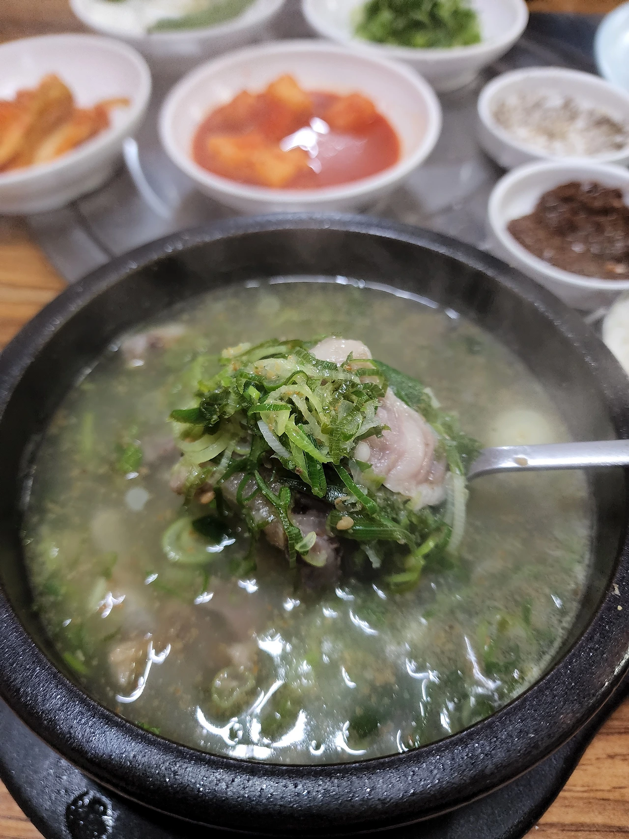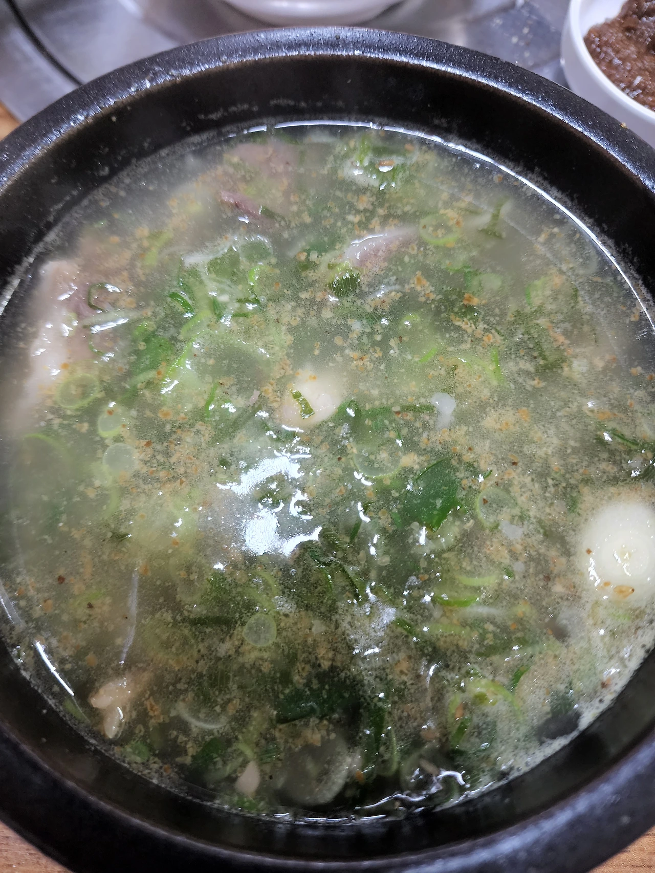 맑은 국물과 대파를 가득 숟가락으로 떠서 입으로 밀어 넣으니 맑고 진득한 소육수의 맛이 깔끔하게 목을 넘어가고 바삭하고 부드럽기까지 느껴지는 다진 대파들의 식감이 즐겁다. 국물이 끈적거리고 숟가락에 육수가 묻어 나오는 느낌마저 들 정도로, 이러한 국물에는 밥을 말아서 녹말의 느낌을 더하는 것이 살짝 미안해질 정도다.
