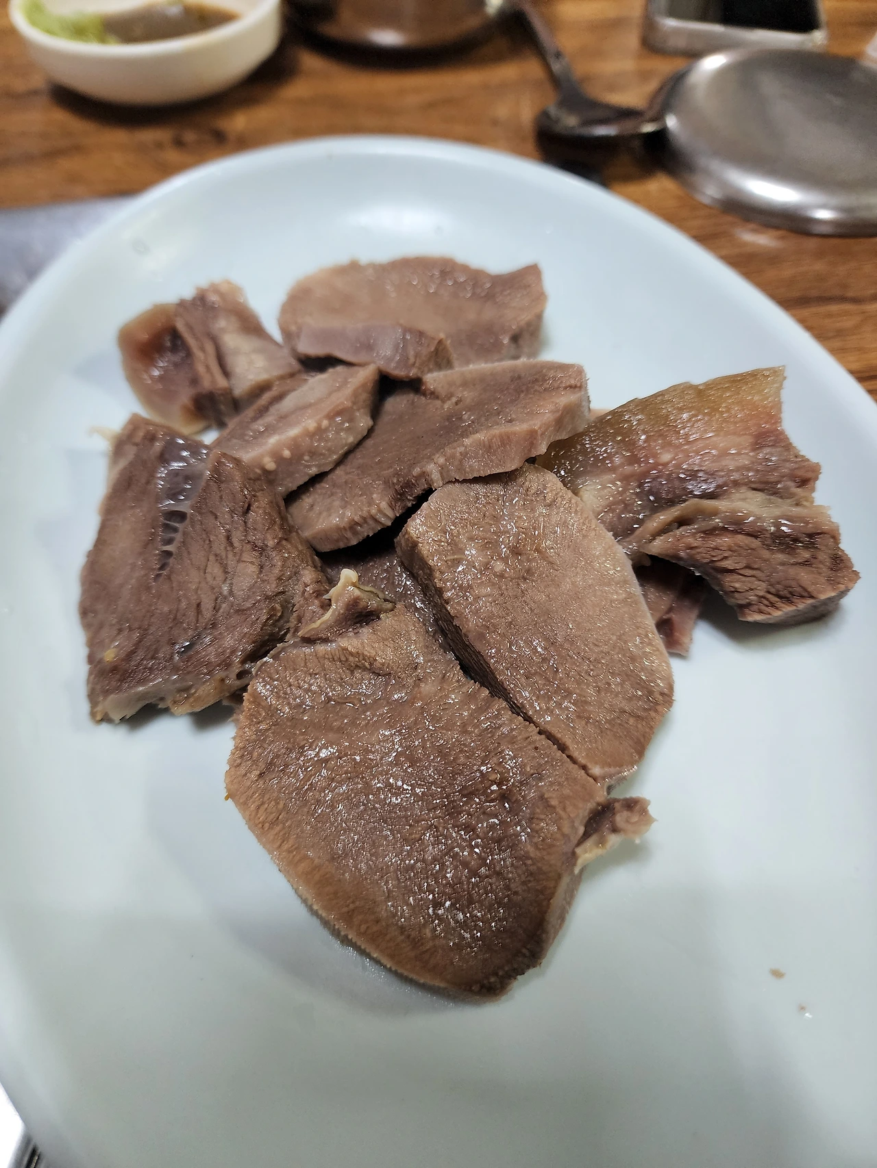 옆에서 이런저런 다양한 탄성과 맛에 대한 호평이 이어진다, 기분이 좋다. 사실 나는 내가 와본 적이 없는 식당에 다수의 인원을 데려오는 것을 꺼리는 편이다, 내가 내 입으로 먹어본 맛이 아닌 이상 남에게 추천할 수 없기 때문이다. 나도 처음 와보는 식당에서 나도 그 맛이 만족스럽고 다른 이들도 그렇게 얘기하면 참 다행스러운 것이다. 사각거리는 다진 대파들과 고슬 거리는 쌀알, 그리고 진득하고 맑은 소육수가 서로 합을 잘 맞추며 입을 즐겁게 한다. 그렇다면 이제 소머리수육은 말하지 않아도 이미 맛있겠지만, 직접 느껴볼 시간이다.