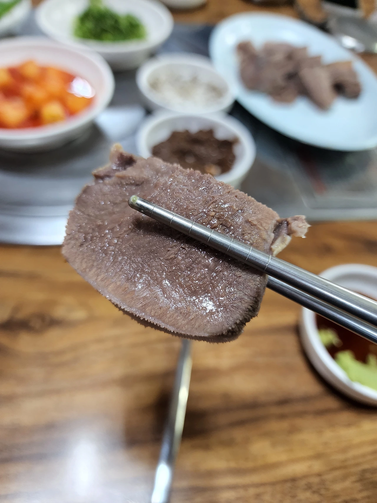 그가 소머리 수육에서도 비계 부위를 먹을 수 있어서 참 다행이라고 생각했다, 그만큼 소머리수육의 살코기와 비계는 식감과 맛이 매우 다른 부위들이었기 때문에 꼭 경험해봐야 한다고 나는 지금도 믿고 있다. 이 글을 읽으시는 분들도 만약 어디서든 소머리수육을 먹게 된다면 비계와 살코기의 식감과 맛을 비교해보시길.
