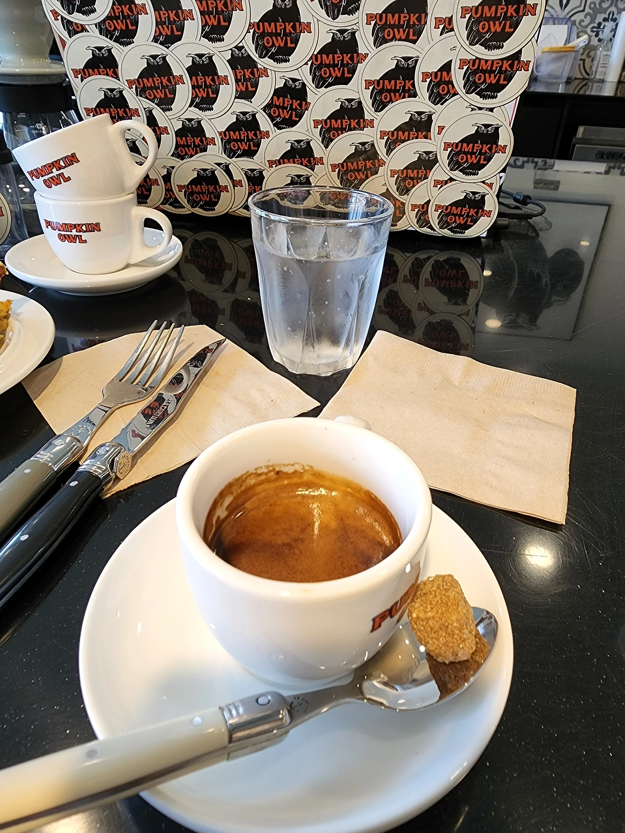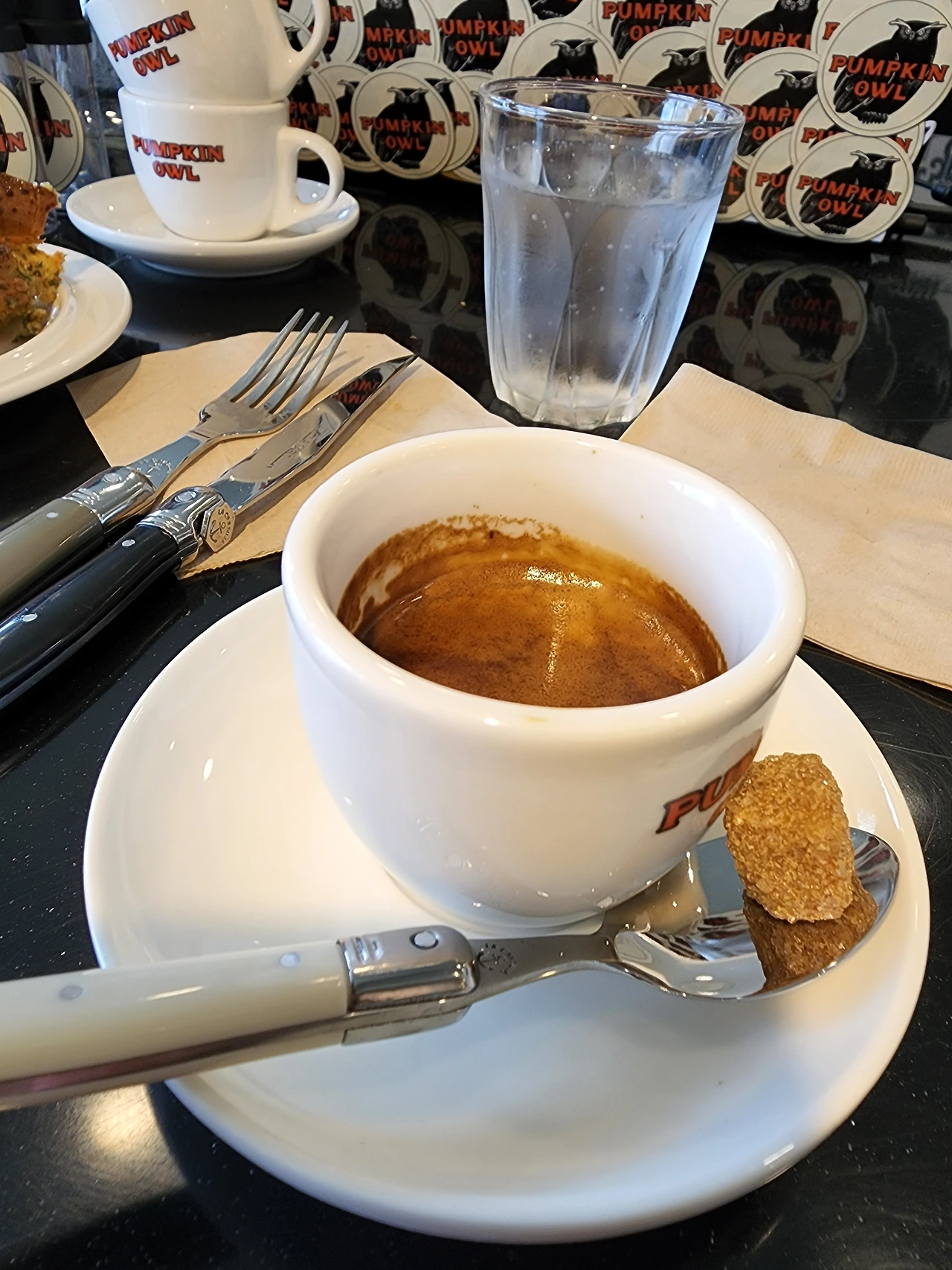펌킨오울에서는 에스프레소에 각으로 된 갈색 설탕과 끝마무리용 탄산수를 함께 제공한다. 에스프레소를 마시는 이에 대한 배려. 나와 이쁜 여자는 숟가락에 올려진 각설탕을 에스프레소에 넣으면서 몇 마디 나눈다.
