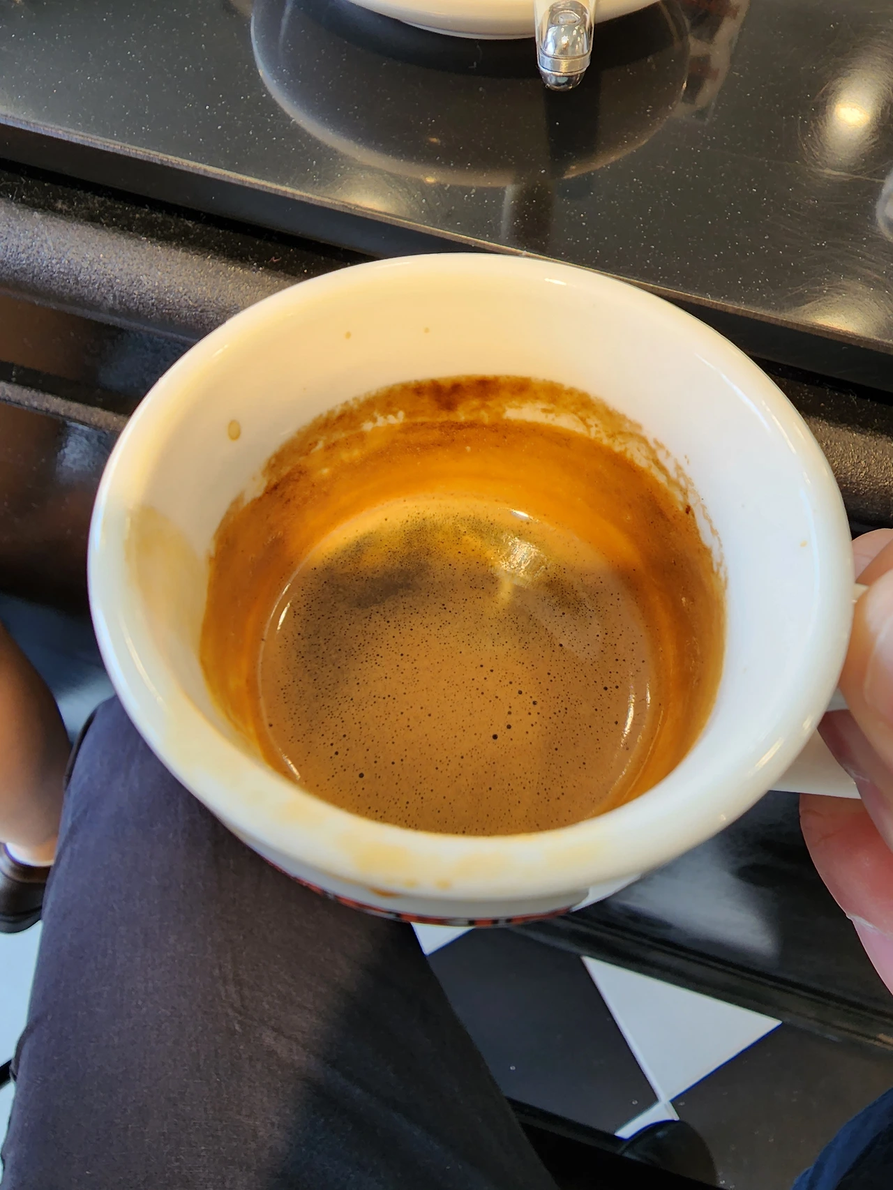 에스프레소는 역시나 기대한 맛이다. 강렬하며, 원두의 풍미가 가득하고, 쌉쌀하며 깔끔하다. 갈색 설탕이 전달하는 약간의 단맛도 사이사이에서 커피의 쓴맛을 지루하지 않게 해 준다. 만족스럽다, 빠르고 확실하게. 이렇게 빠르게 에스프레소를 마시고 나니 녹지 않은 설탕 결정들이 반짝거리면서 에스프레소 잔 바닥에 남아있다.