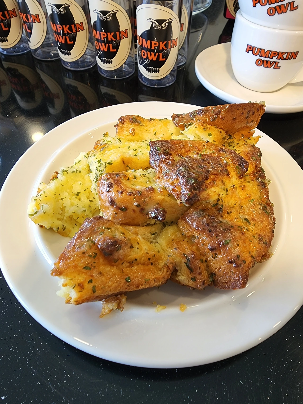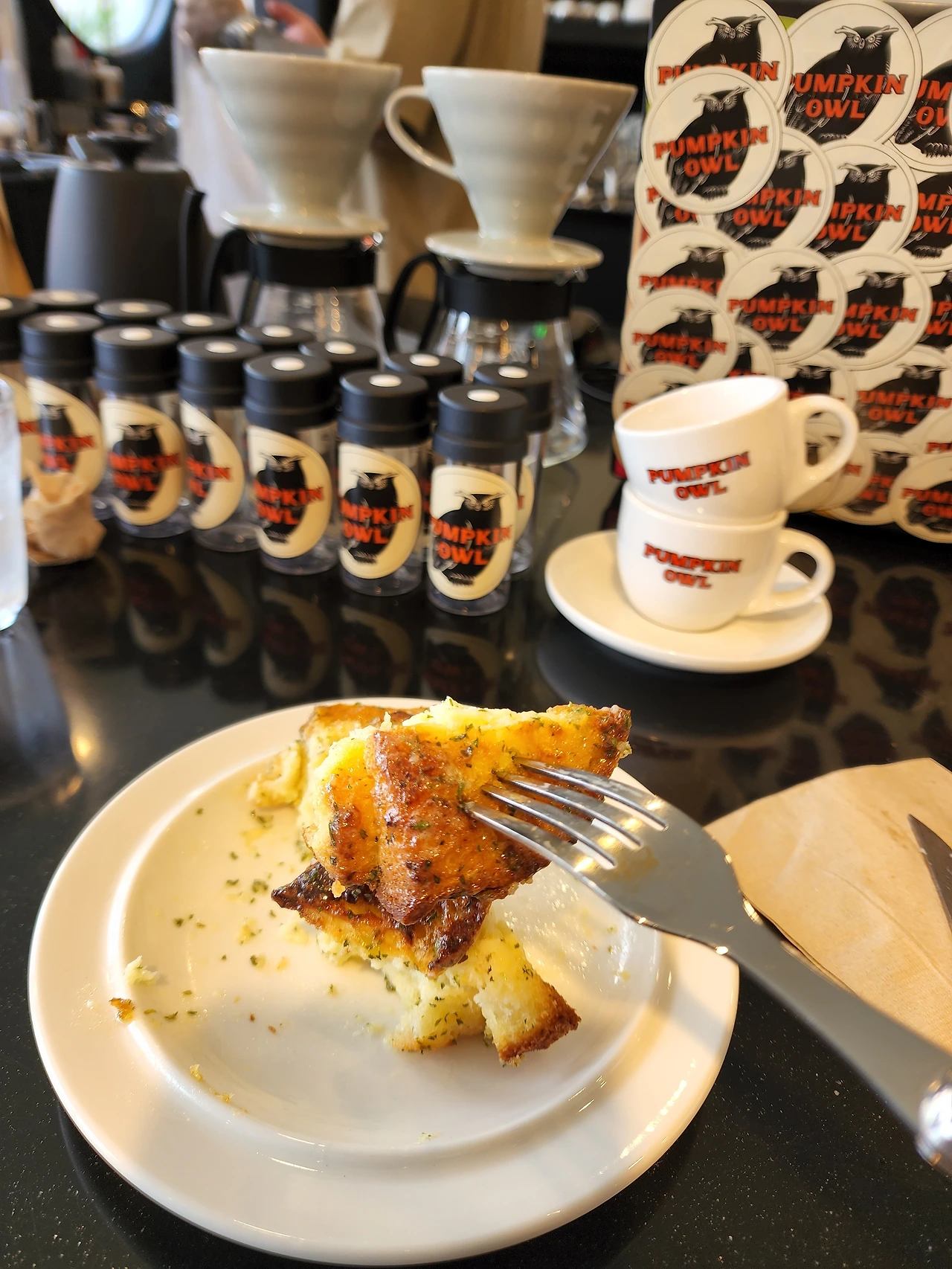평소에도 예의가 없는 사람은 아니지만, 맛있는 음식 앞에서는 더더욱, 한없이 공손해지는 나다. 나는 내 눈앞에서 모락모락 김을 내쉬며 조각으로 나뉘어 있는 빵푸딩을 보며 10년 전 호주에서의 기억에 감상에 잠시 젖었다. 어느 빵집에서 우연히 먹었던 그 부드러움과 푹신함, 그리고 달콤함. 잊을 수 없다. 그리고 그 기억은 마늘 버터가 더해져 내 눈앞에 살아있는 것이다, 강릉의 펌킨오울에서.
