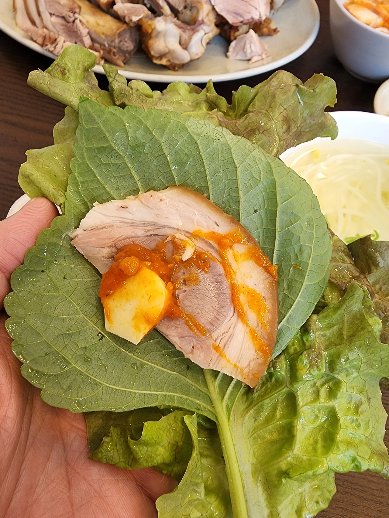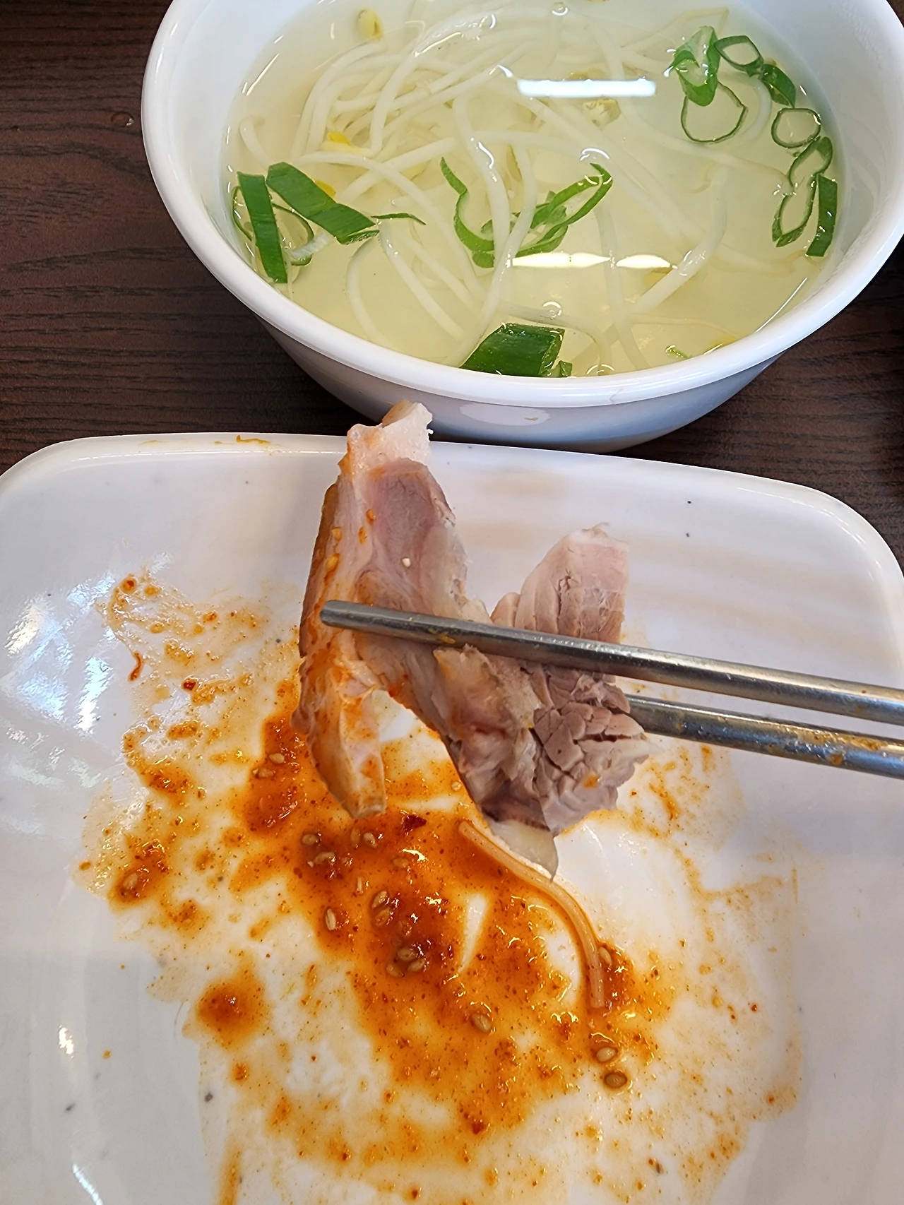 그 말을 듣고 우리는 일반 족발 대와 비빔국수를 2그릇을 주문했다. 냉콩나물국과 간단한 쌈을 위한 반찬들이 나오고 우리는 이런저런 얘기를 하면서 족발을 기다렸다.