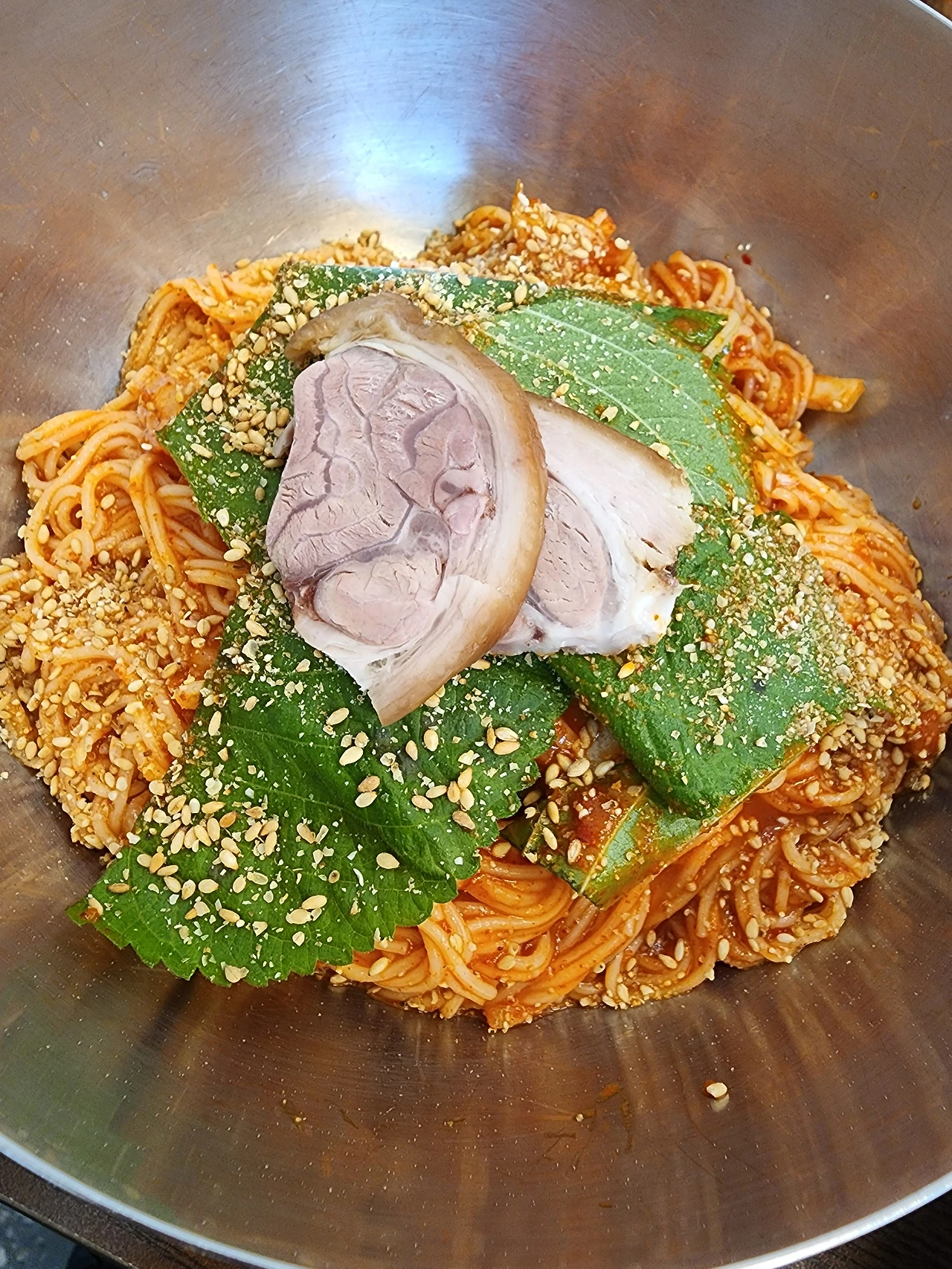 족발을 반 정도 비우고 있을 무렵 시기적절한 비빔국수의 등장에 함박웃음을 짓는다. 어디를 가서도 비빔국수는 대체로 맛이 다 괜찮은 음식이지 않은가. 매콤 달콤 짭짤한 맛을 기대했다. 깻가루가 잔뜩 뿌려진 밑으로 깻잎 2장이 아름답게 포개져 있었다. 군데군데 작은 김치 조각들이 보이고 연주홍빛을 내는 양념장에 모든 부분이 완벽히 버무려진 바람직한 비빔국수의 모습. 맛을 어떨까. 젓가락으로 적당히 말아서 한입을 쳐본다.