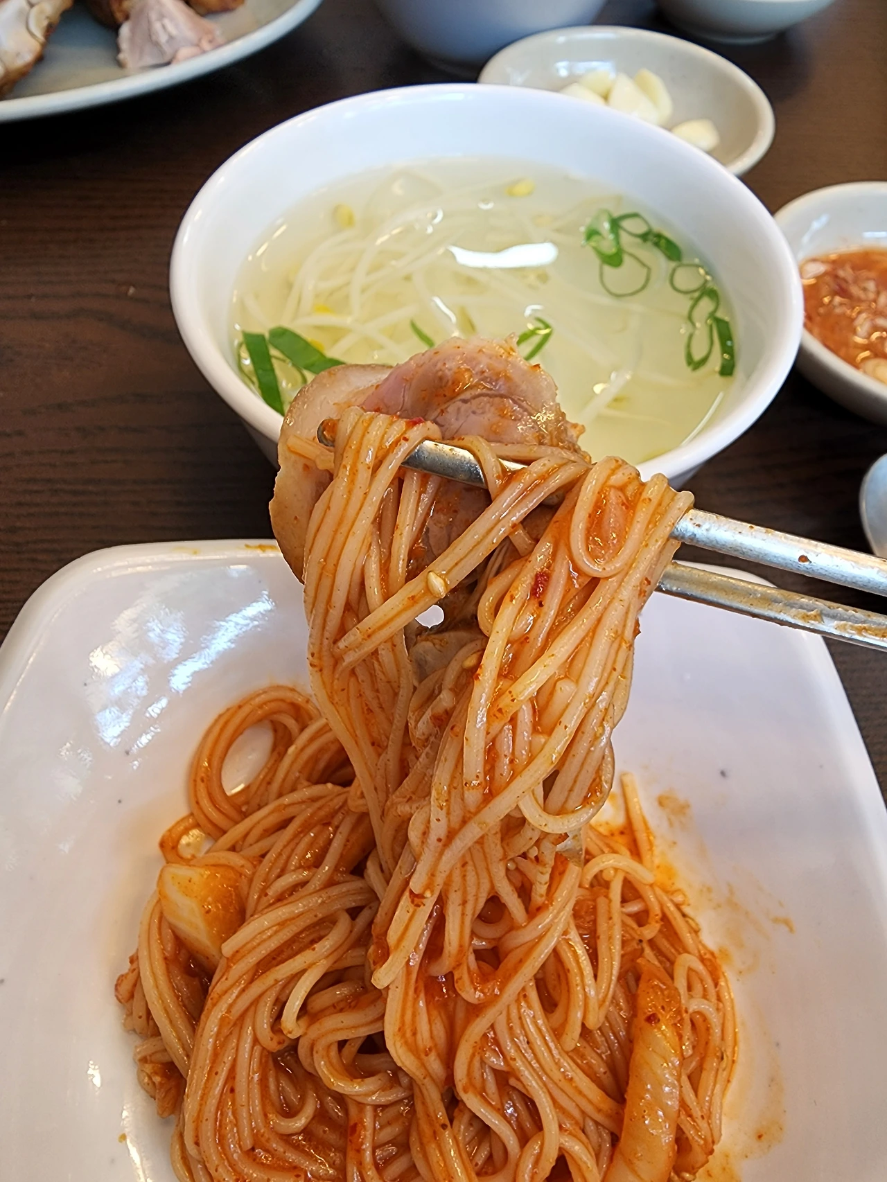 이번에는 잘게 썰려서 들어간 신김치의 아삭함과 그 새콤함이 더 도드라지는 맛이지만 매끄럽고 찰랑거리는 면발과 국수에 묻은 양념이 적지 않은 양임에도 불구하고 고소함과 매콤함으로 상큼하게 끝이 난다. 이 비빔국수, 족발과 먹으면 어떨까? 궁금증은 잠시, 실행은 빠르게. 바로 족발을 한점 잡아 국수에 말아서 먹어본다.