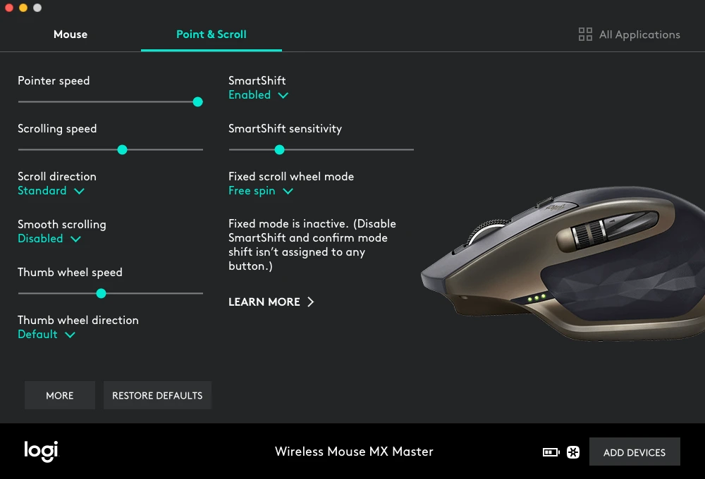 게이밍 마우스와는 다르게. 반면에. 한편, 사무용 마우스인 MX Master는 다양한 기능 설정을 제공한다. 특히 무한 휠은 논문이나 보고서와 같은 긴 문서를 보는 데에 최적화되어 있는데, 휠 사용 속도에 따라 일반 모드와 초고속 모드의 전환이 자동으로 이루어진다. 굉장히 편하다. 물론 버튼 클릭을 통해 수동으로 바꿀 수도 있다.