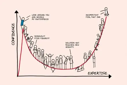 Dunning-Kruger Effect를 보면 학위과정 진행에 따른 얇아짐을 이해할 수 있다. 학부 때 나는 이제 모든 것을 다 알고 있다는 자신감에 도취되었던 사람은 석사 과정에 들어선 순간 나는 아무것도 몰랐다는 것을 인지하게 되고, 박사가 되면 참 감사하게도 나만 모르는 건 아니었다는 사실을 알게 된다.