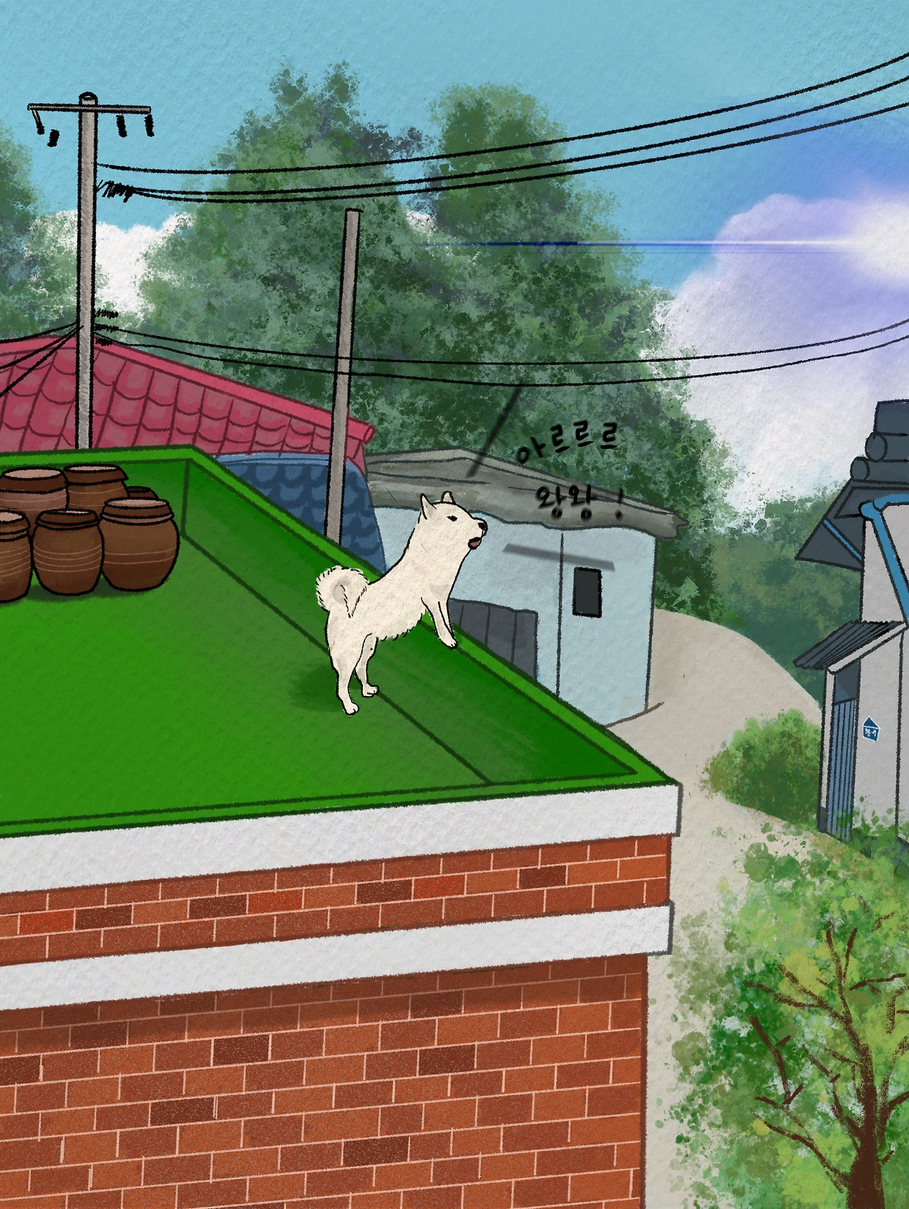 봄볕을 쬐러 옥상으로 향했다. 골목으로 드나드는 사람 소리가 날 때면 재빠르게 난간에 두 발을 걸치고 용감한 개라도 된 양 짖어댔다. 사람들 발걸음 소리도 이내 고요해졌다. 볕조차 고요했다. 갓 피어난 개나리꽃이 감기에 걸리지 않게 바람도 잠잠했다. 꽃샘추위는 한풀 꺾였다. 난간 벽에 붙어서 잠들던 흰둥이는 갑자기 귀를 쫑긋 세우며 ‘왕왕’ 짖기 시작했다. 매일 들리는 자동차의 경적 소리 때문이 아니었다. 낯선 소리를 걸러내는 능력 덕분에 흰둥이는 ‘집을 지키는 개’로서 가족들의 사랑을 받고 있었다. 하지만 이 소리는 처음 듣는 소리다. 흰둥이가 태어난 지 8개월 차로 드론 날아다니는 소리도 들어봤지만 이건 드론 소리도 아니다.