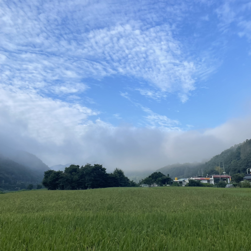 잿빛에 길들여진 며칠을 보내고 푸른 하늘빛을 보니, 우리 집 앞 풍경이 낯설었다. 하늘색을 배경으로 비늘구름과 안개가 시선을 잡았다. 흐린 하늘을 겨우 빨아내고 서서히 푸른빛을 찾아갔다.