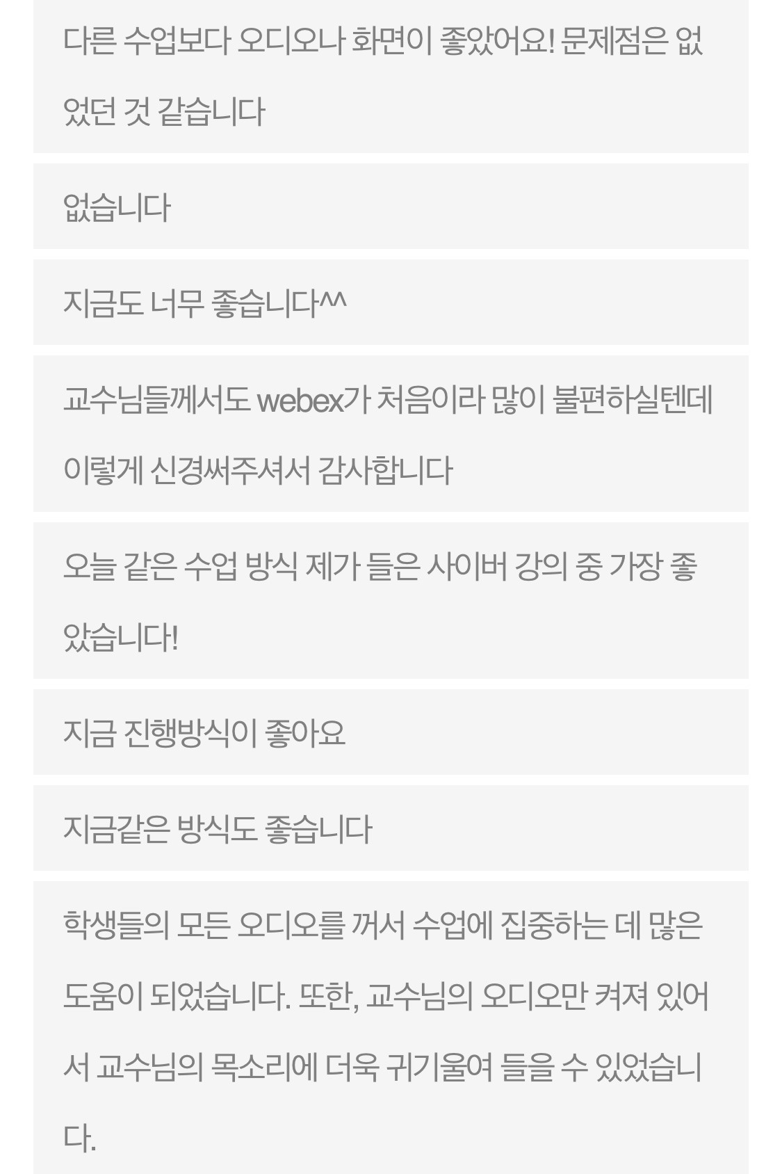 아래는 수업 환경에 대한 몇 가지 객관식 질문에 이어 마지막으로 수업 진행 건의/제안에 대해 주관식으로 물어본 설문지의 일부 결과다. 그냥, 기억하고 이번 학기 또 잘 살아내려고 살포시 캡처. :)