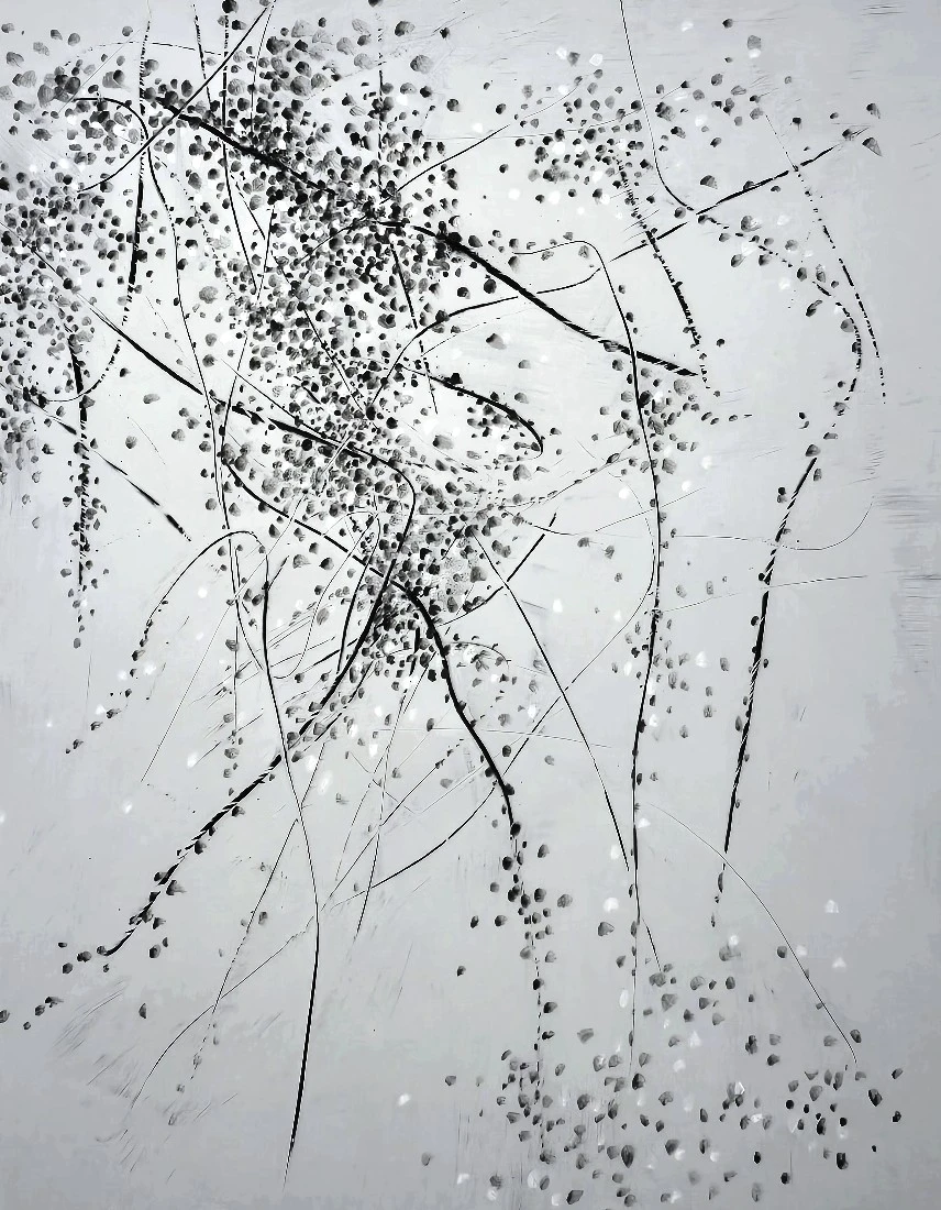 올해 100세인 박인경 작가의 작품도 전시되고 있는데 옛날 것이 아니고 2025년 작품이다. 노익장이란 말이 생각났다. 솔직히 처음에는 뭔가 이상해, 잘 못 쓰였나 생각했다. 누구한테 물어보기도 좀 그렇고 해서 그냥 관람을 하는데, 봄바람 불어 화려하게 꽃이 지며 꽃잎이 날리는 느낌이 나는 그림이 멀리 보인다. 회색바탕에 검은 물감으로 그려진 그림에서 화사한 봄바람이 느껴졌다. 아! 참 좋다. 역시 차명희작가로구나 하면서 나가려 하는데, 차작가님이 갤러리 문을 열고 들어오신다. 이런 우연이.. 커피 한 잔 하고 가라고 하셔서 앉아 이야기를 나누는데, 100세의 박인경 작가는 이응로 화백의 부인이고, 지금도 휠체어에 앉아 그림을 그리신단다. 그 참 대단하시다..