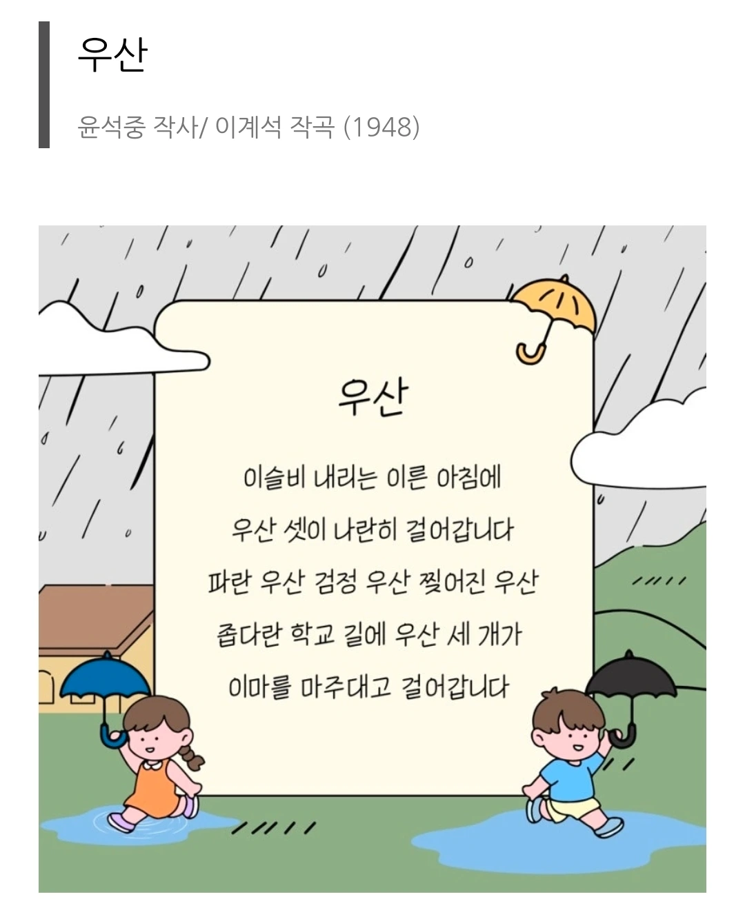 제목은 '우산'이고 1948년 윤석중 작사, 이계석 작곡으로 나온다. 그런데 놀라운 것은 내가 기억하고 있던 가사가 거의 다 맞다는 점이다. 아~ 나 아직 죽지 않았네...