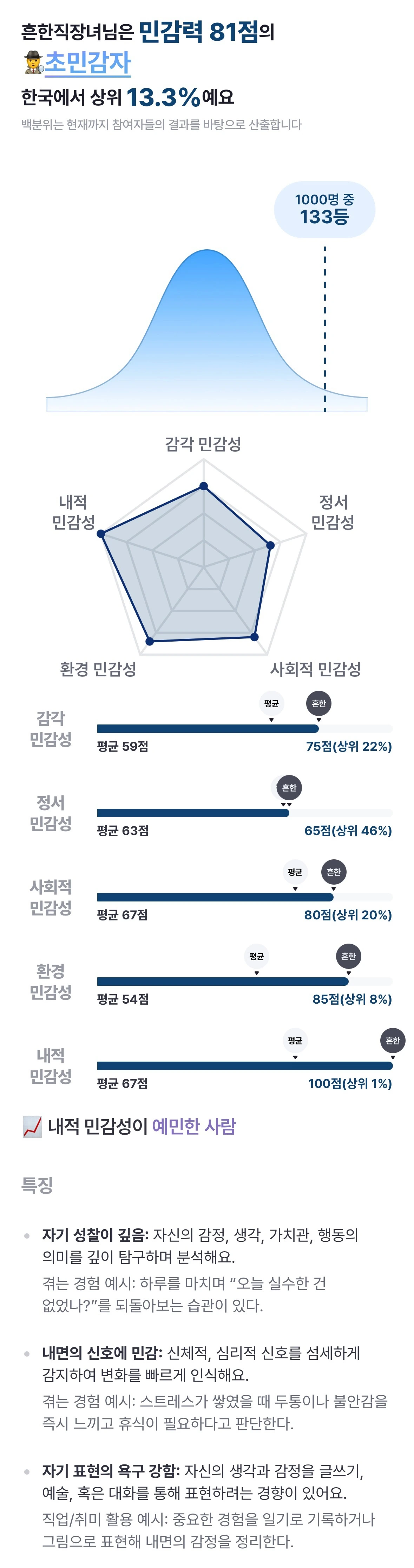 그런데 눈에 띄는 지표가 하나 있다. 내적 민감성이 상위 1%라는 거다. 점수로는 무려 만점에 해당하는 100점이다. 내적 민감성이 예민한 사람에 대한 설명을 읽어보면, 거의 나를 간파당한 수준이다. 과도한 반추사고와 내적 모니터링, 그리고 기록과 표현 욕구. 나란 인간의 함축적 표현일 수도 있겠다.