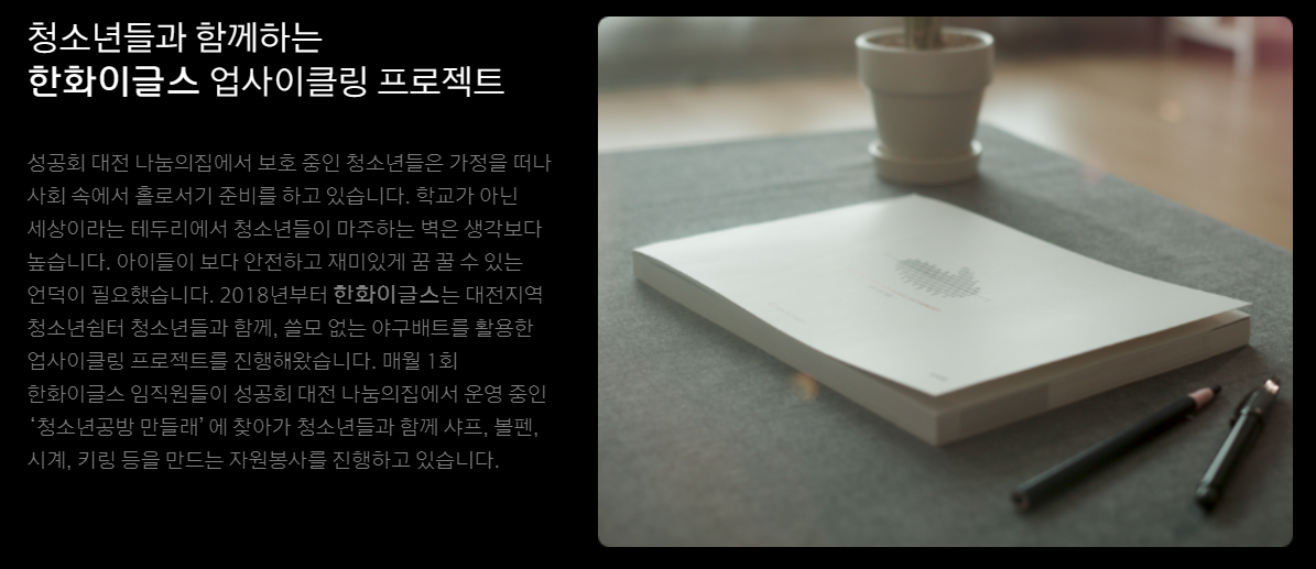 한화이글스와 협업하여 버리는 야구배트를 받아와 펜 등의 굿즈를 제작한다. 야구배트 이외에도 야구공, 자투리 나무 등 여러 버려지는 재료를 활용한다.