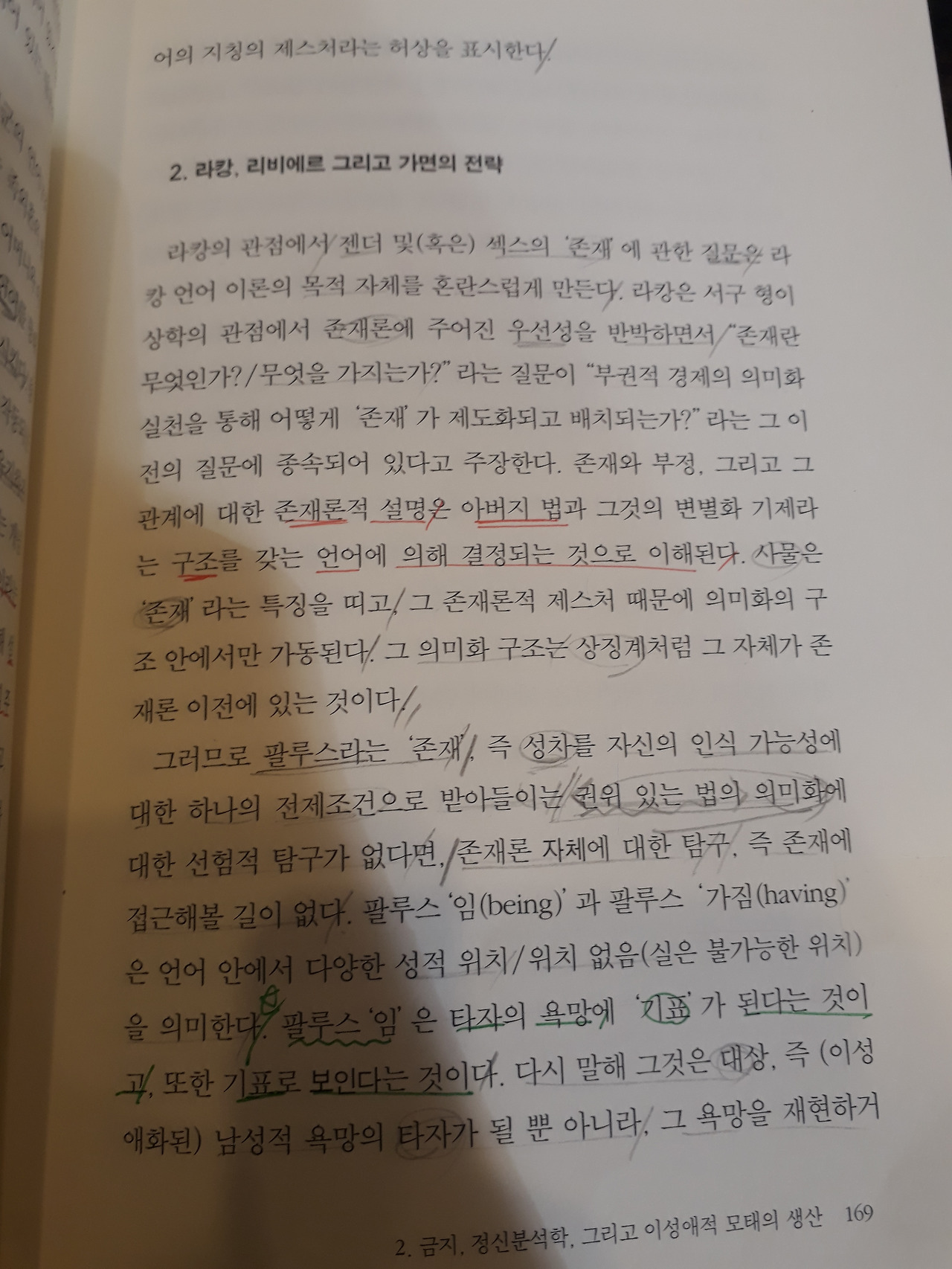 이런 관계는(팔루스)이기와 (팔루스)가지기에 초점을 맞추게 될 것이라고 말해두자. 왜냐하면 이들 관계는 한편으로 그 기표 속의 주체에게 현실성을 주고, 다른 한편으론 의미를 만들기 위해 그 관계를 비현실적인 것으로 만드는 모순적인 효과를 발휘하는 어떤 기표, 즉 팔루스를 지칭하고 있기 때문이다.(『젠더 트러블』, 174쪽)