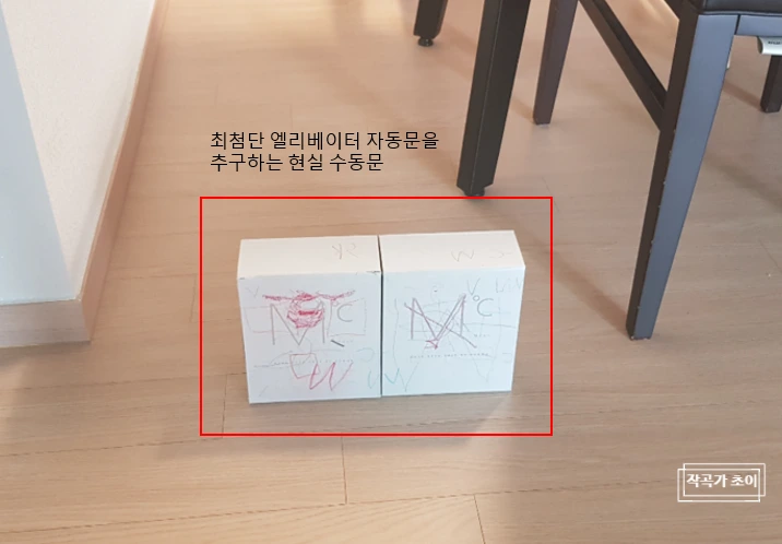 하지만, 현실은 사람이 일일이 열어줘야 하는 박스로 만든 수동 엘리베이터 문.