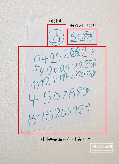 엘리베이터를 타면, 벽에 버튼란이 있죠. 맨 위에는 위기 상황에 연락할 수 있는 비상벨 버튼, 그리고 승강기 고유번호가 있고요.