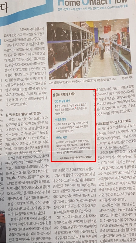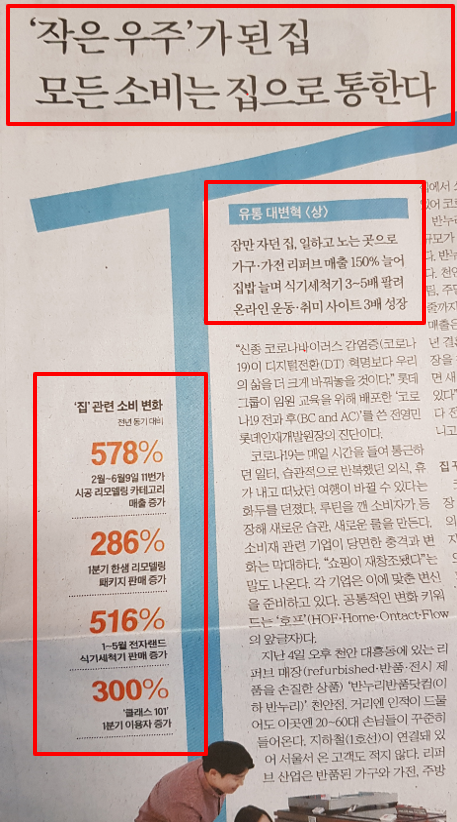 오랜만에 종이신문을 봤다. 아직 정기 구독을 하고 있진 않지만, 읽어 보니 조만간 꼭 정기 구독해야겠다는 생각이 들었다. 좀 지난 신문기사였지만, 코로나 이후 우리의 삶을 반영한 흥미로운 기사들이 많이 있었다.