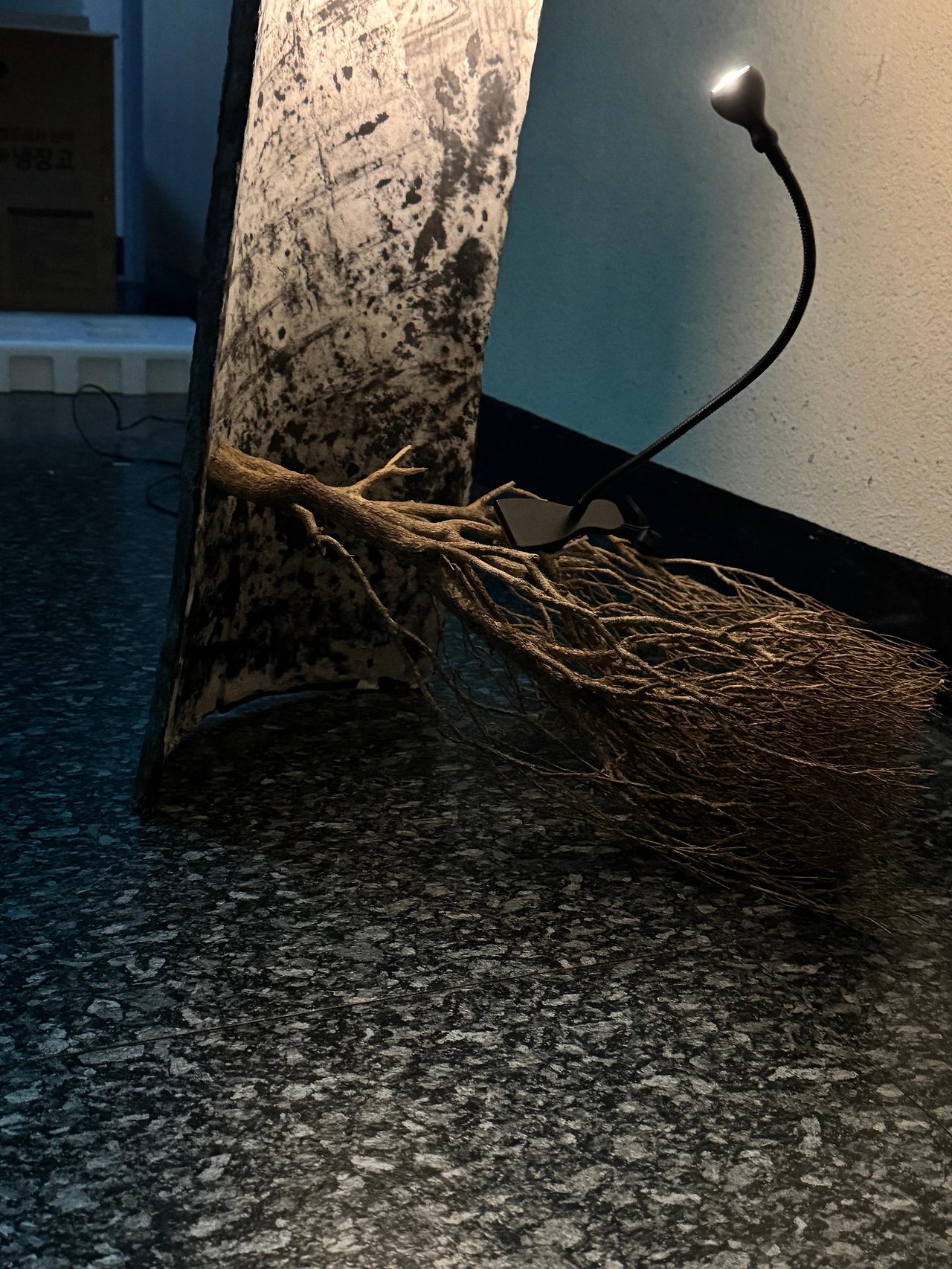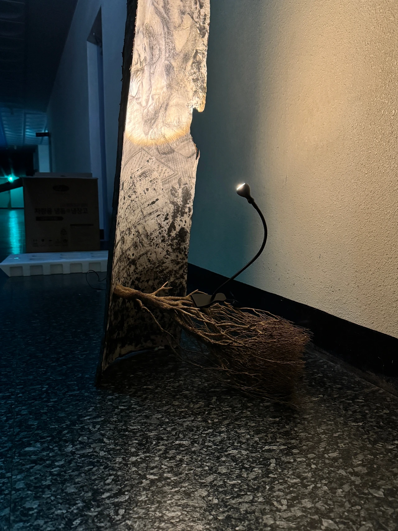 작품으로 등장했던 원목에 기후변화가 만든 폭염과 반지하 높이 전시장이 결합해 만든 지독한 곰팡이가 생겼다. 몇 번의 약품살포에도 곰팡이의 번식을 막을 수 없었다. 회생포기로 다시 야외에 방치되던 그 나무는 허물 벗듯 자신의 흔적들을 불리했다. 그 결과 나에게 껍질에 대해 주목하도록 했다.