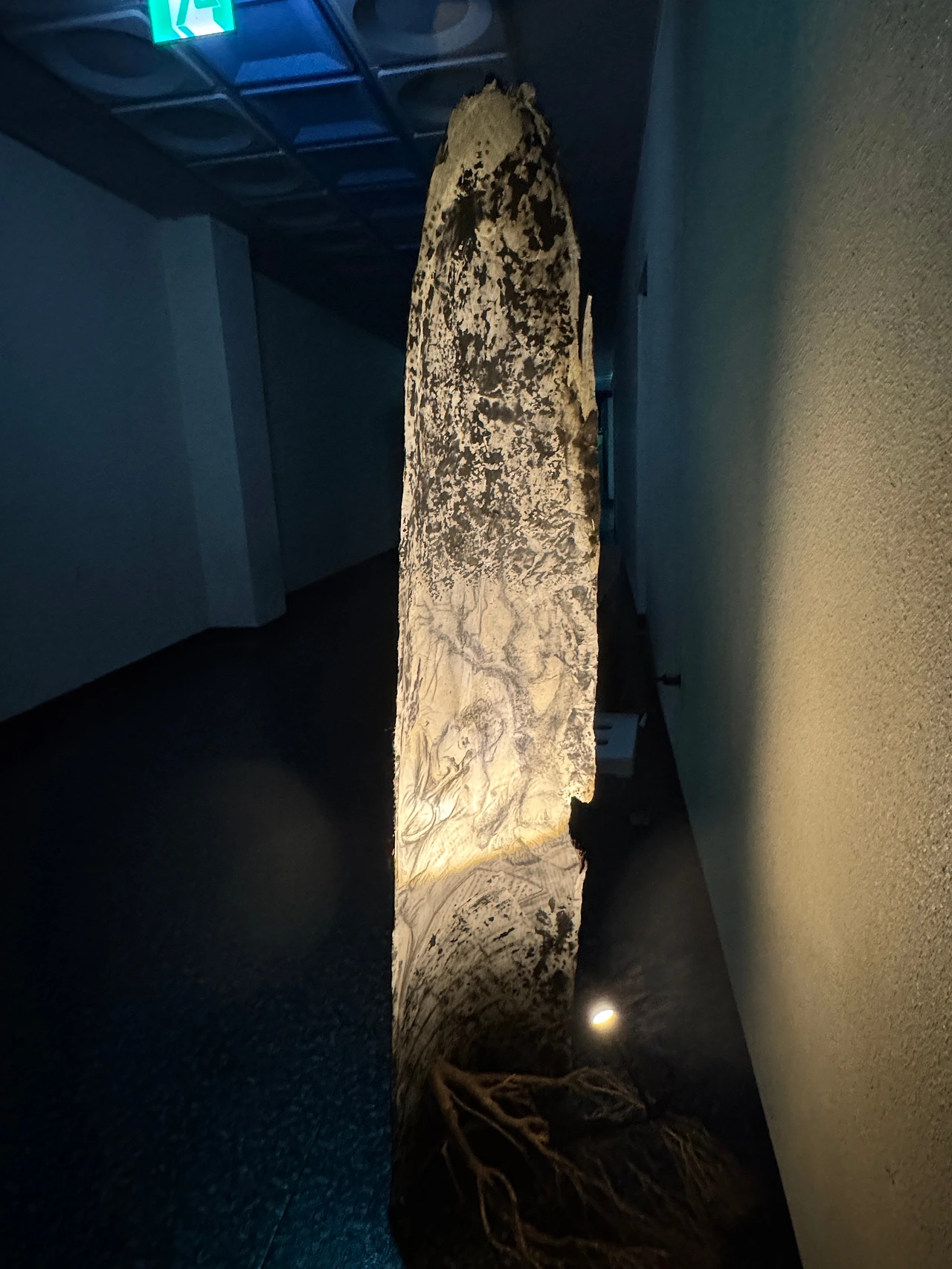 - 안쪽은 아스팔트와 나무의 탁본, 목탄 드로잉이 겹쳐진 공간이다. 이 안쪽은 빛으로 채워져 노숙자의 쉼터가 된다. 도시에 버려진 이들이 잠시 몸을 뉘일 수 있는 은신처, 그것이 껍데기 안에서 가능해진다.