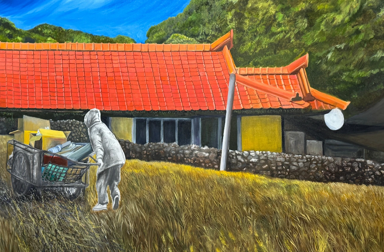 나는 인물과 리어카를 목탄으로, 배경의 집과 들판은 유화로 그렸다.