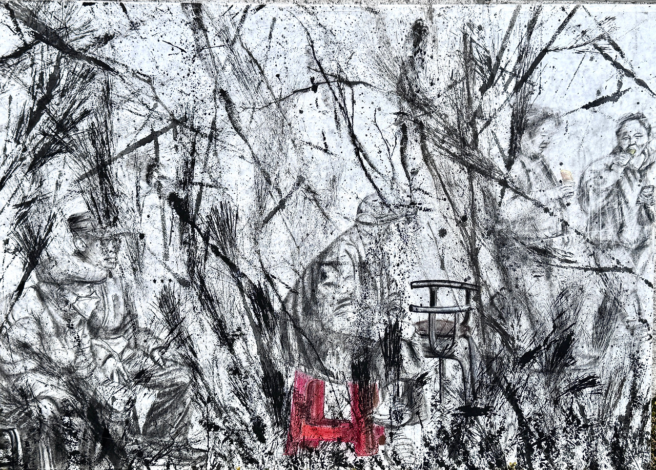 나는 그 보이지 않는 존재를 직접 그리는 대신, 그것이 스쳐 지나가며 남긴 선들과 흔적을 화면 위에 겹쳐 올렸다. 떨어진 나뭇가지, 도로 확장으로 잘려나간 소나무의 가지, 추수 후 바닥에 버려진 식물의 잔해들—모두가 사람들이 지나오고 떠나온 흔적이다.