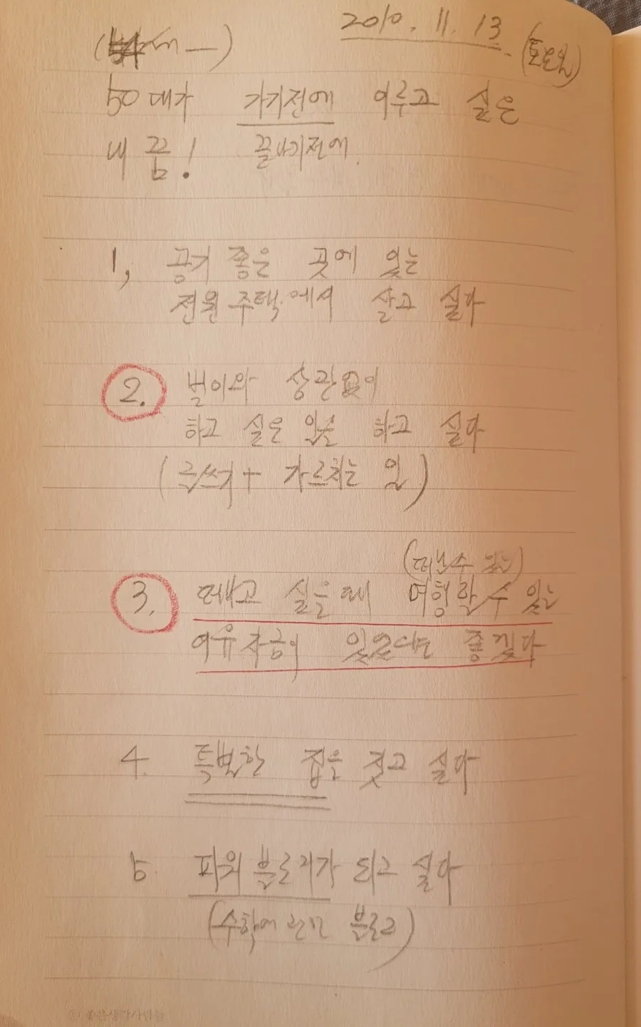 그중 한 페이지에는 '50대가 가기 전에 이루고 싶은 내 꿈'의 5개 항목이 연필 글씨로 또박또박 쓰여있었다.