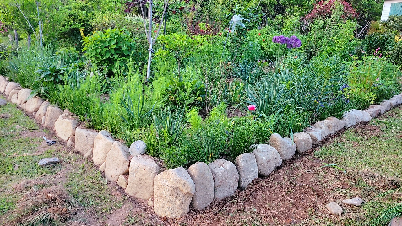 그걸 그냥 지나칠 리 없는 우리 부부는 며칠에 걸쳐 돌을 실어 나르고, 낡은 통나무를 들어내고는 그 자리에 돌로 꽃담을 쌓고 있다.