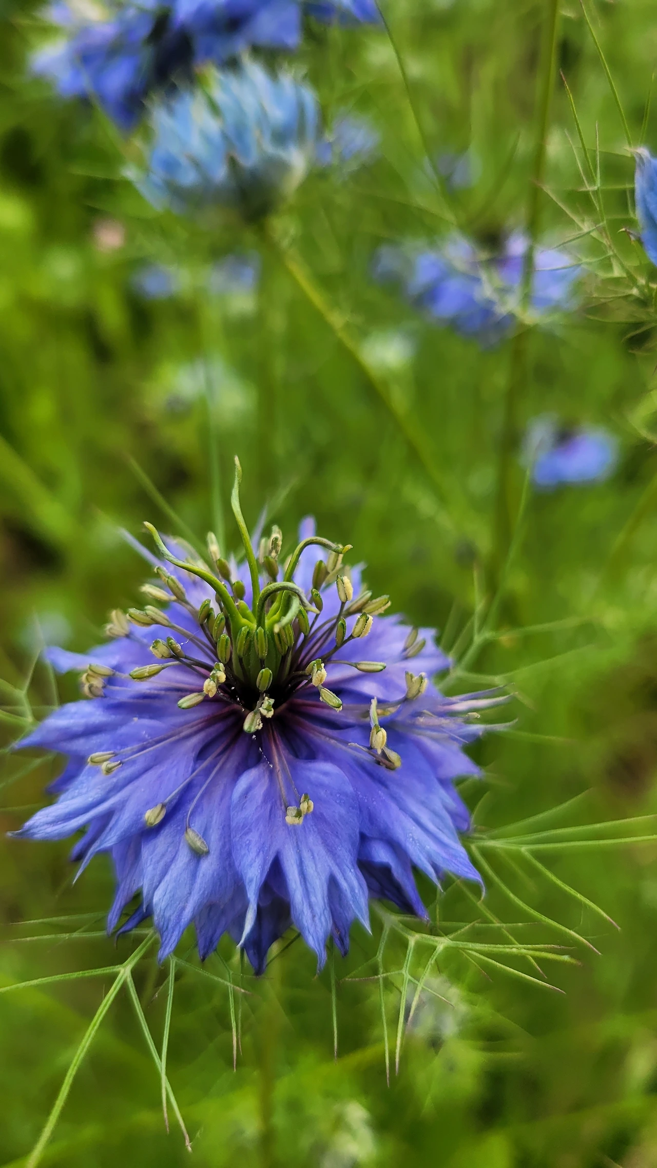 양귀비밭을 만들 생각으로 자연 발아한 양귀비를 그대로 두었더니, 수레국화와 뒤엉켜 작은 숲이 되어버렸다.