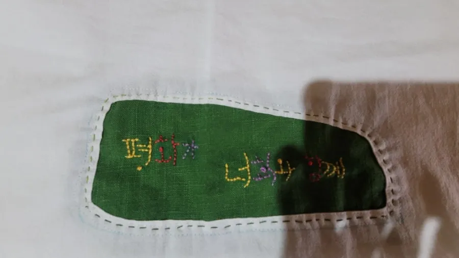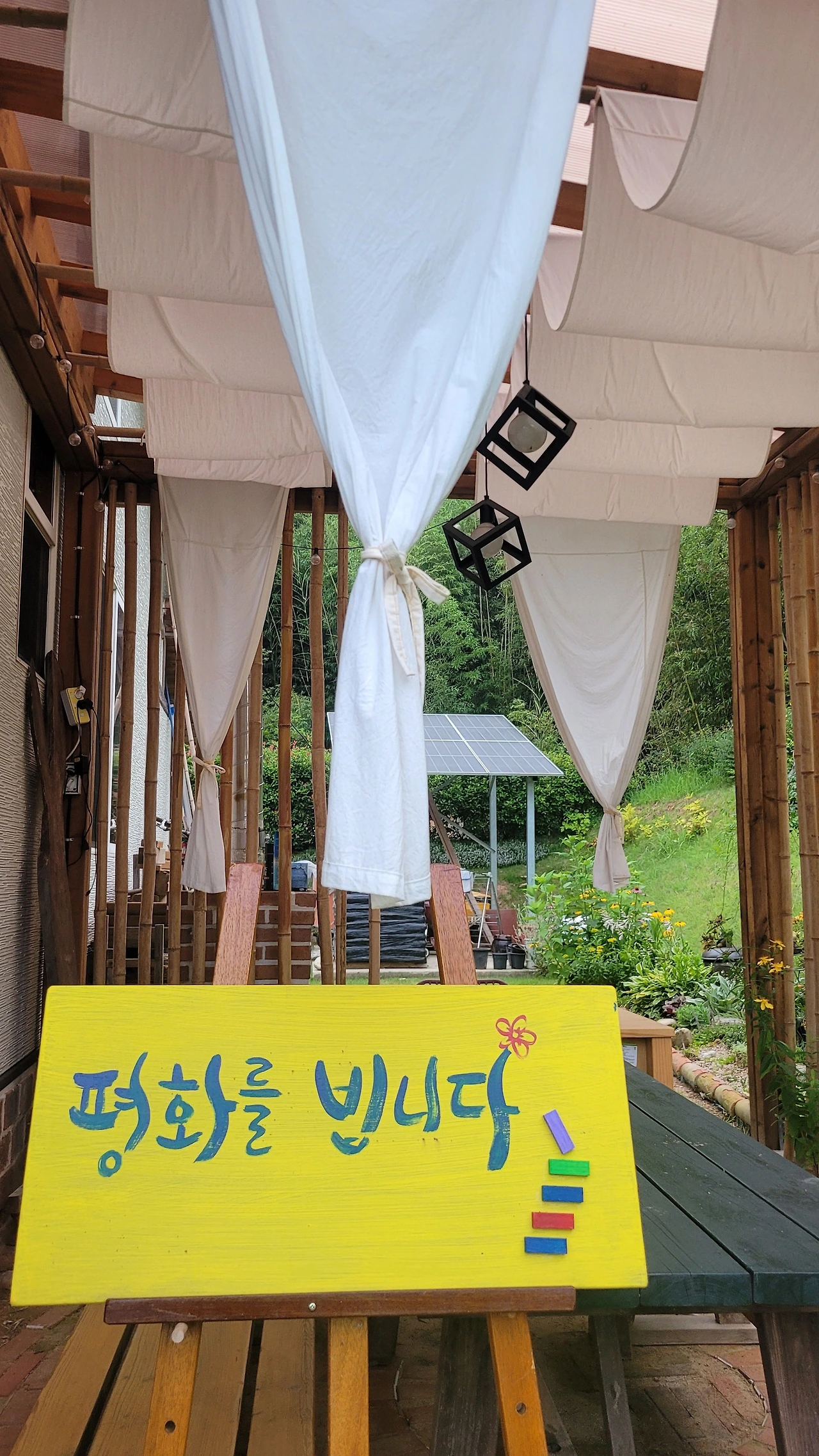 ‘평화를 빕니다’라는 글귀를 나무판에 적어 이젤에 기대 세워두었다.
