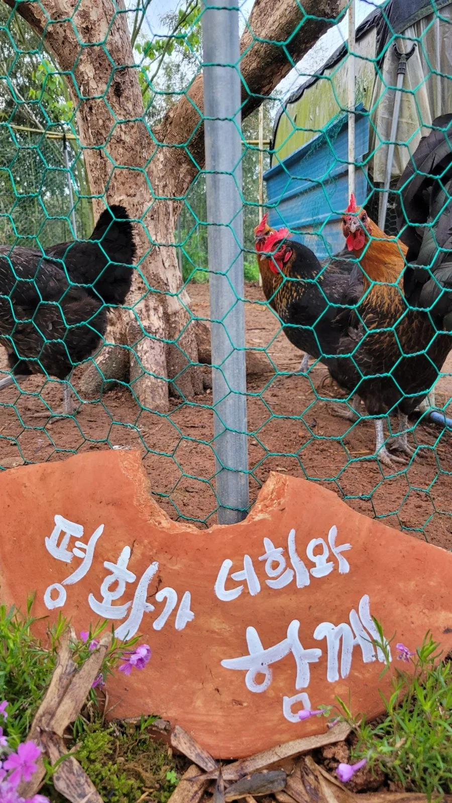 ‘평화가 너희와 함께’라는 문구를 하얀 아크릴로 정성스레 적어 닭장을 줄이고 생긴 작은 빈자리 한켠에 놓았다.