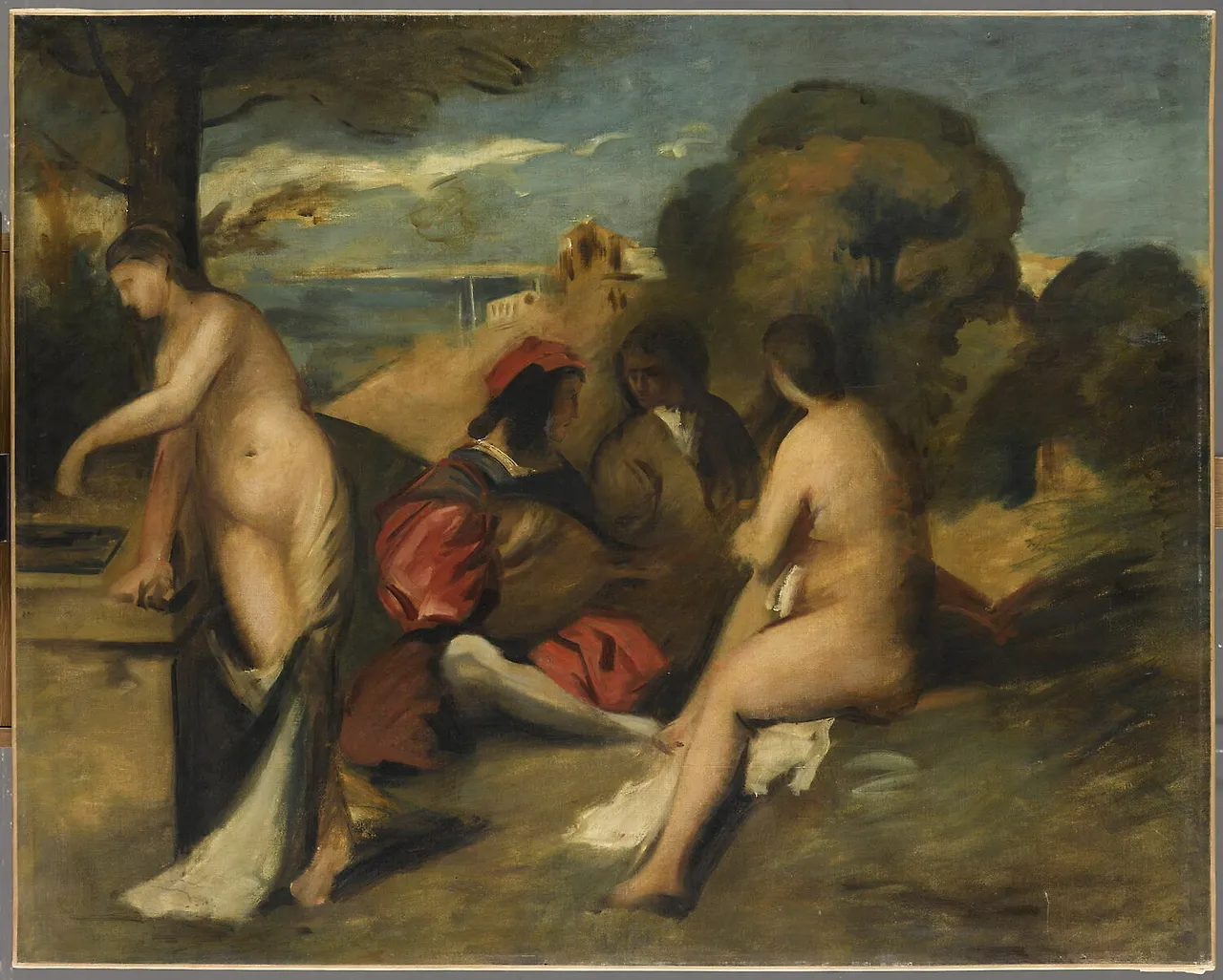 마네의 「풀밭 위의 점심 식사」가 보여주는 '옷을 걸친 남자들과 그렇지 않은 여인' 테마는 조르조네(Giorgione)의 「전원의 합주」를 모티브로 하고, 그 구도는 마르칸토니오 라이몬디(Marcantonio Raimonde)가 판화로 새긴 라파엘로의 「파리스의 심판」에서 가져온 것으로 알려졌다. 「풀밭 위의 점심 식사」의 기초가 된 두 작품은 내용과 형식 면에서 똑같이 선정적이지만, 아무런 스캔들로 일으키지 못했다. 앞선 두 작품이 신화적 세계를 그리고 있는 반면, 마네는 눈앞에 펼쳐진 세계, 바로 우리의 일상을 그려냈기 때문이다. 평상복을 걸친 남성과 도발적인 나체의 여성은 그 자체로 과거의 규범과 관습을 무너뜨리는 전복이었다.