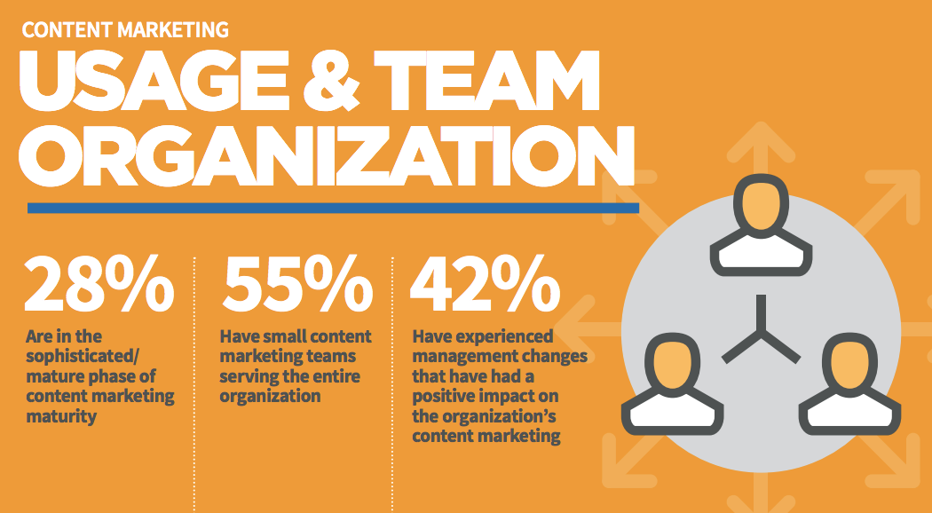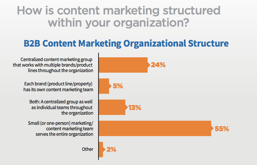 Content Marketing Institute에 따르면 55%의 기업은 기업 내 소규모 컨텐츠 마케팅 팀을 두고 조직 전체를 지원한다고 말했다.