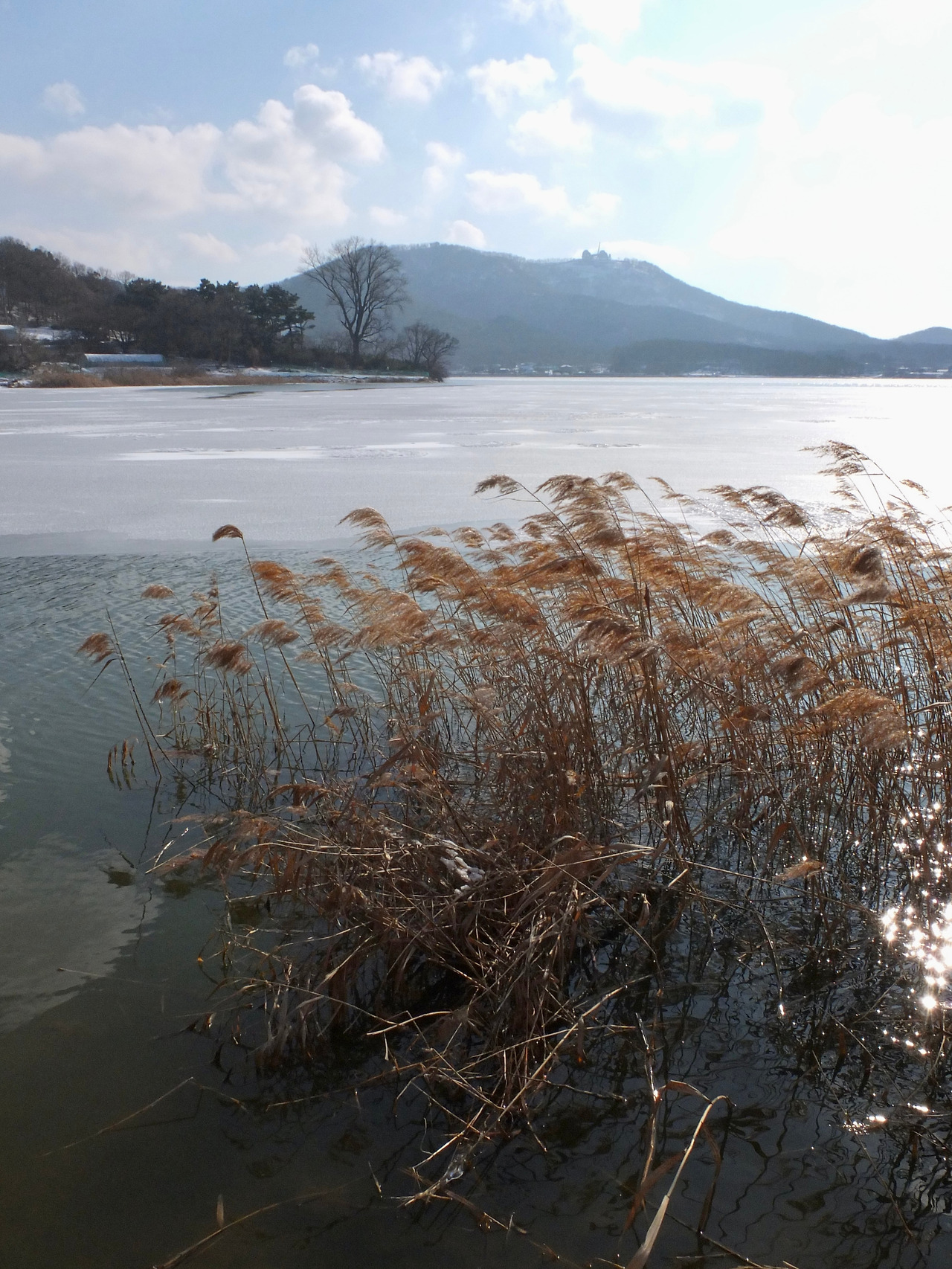 저수지 뭍을 밟으니 발밑에서 부서지는