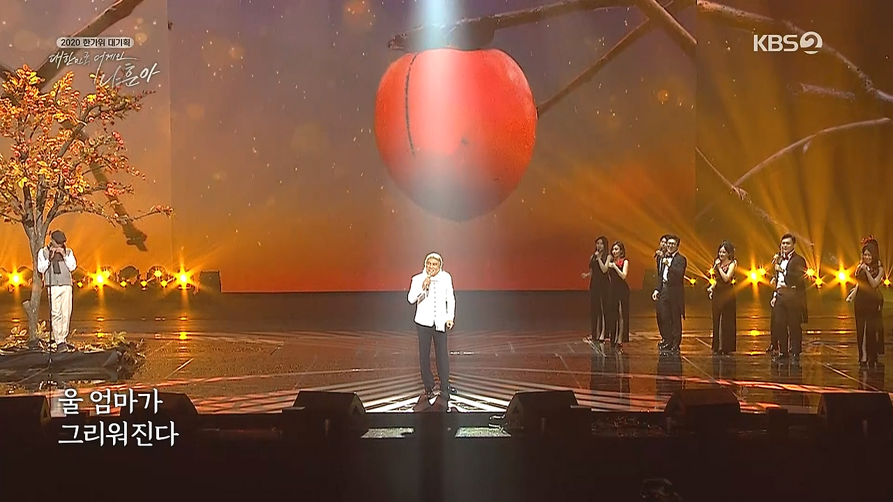 분위기를 다시 한번 틀었다. 인트로에서 AR로 홍시가 열린 감나무가 등장했고 무대 위 나무 아래네는 하림이 등장해 하모니카를 연주했다. 노래의 배경이 겨울이다 보니 나훈아도 깨알 디테일로 흰 목도리를 둘렀다. 이 노래는 노래 분위기 자체는 밝은데 '어머니'라는 코드를 건드리다 보니 듣다 눈물이 흘렀다. 뒷배경에 깔리는 감나무와 커다란 홍시, 그 시절 어머니들의 흑백사진이 깔리는데데 분명히 퀄리티가 그렇게 높지 않은데, 이상하게 잘 어울렸다.