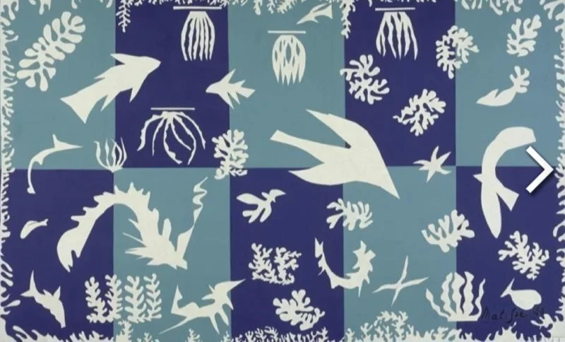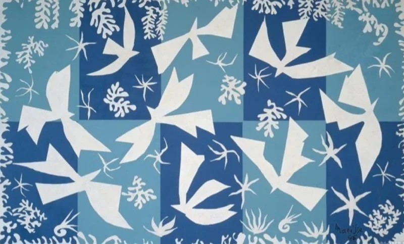 말년의 마티스는 병과 노화로 인해 더 이상 붓을 들 수 없게 되자, ‘색종이 오리기’라는 새로운 형식으로 예술을 이어갔다. 그는 휠체어에 앉아 가위로 색지를 자르고, 그것을 벽에 배치하며 이전과는 또 다른 회화의 세계를 열었다. 대표작 《푸른 누드》 연작과 《폴리네시아의 바다》는 바로 이 시기에 탄생했다. 이 작업들은 육체의 한계를 예술로 승화시킨, 고요하면서도 강렬한 저항이었다. 단지 색과 형태라는 가장 단순한 요소들만으로도, 얼마나 깊은 감정과 울림을 만들어낼 수 있는지를 마티스는 다시 한번 증명해 보였다. 이 작품들은 오늘날까지도 현대 예술에 깊고 지속적인 영향을 미치고 있다.