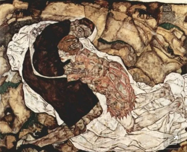 대표작 《죽음과 소녀》는 이러한 복합적 감정의 응축체다. 그는 연인이었던 발리 노이질을 모델로, 죽음의 형상과 서로를 끌어안는 여인의 모습으로 그렸다. 얼핏 보면 따뜻하고 친밀한 포옹 같지만, 이 그림 속 ‘죽음’은 실레 자신이다. 사랑하는 사람을 품에 안고 있지만, 그것은 끝을 예감한 사랑, 상실을 감싸 안으려는 사랑이다.