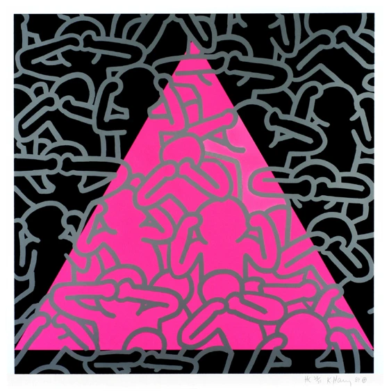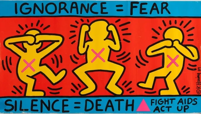 《Ignorance = Fear / Silence = Death》는 해링이 생의 마지막 시기에 남긴 가장 강력한 정치적 선언 중 하나다. 이 포스터 작업은 AIDS 위기 당시의 침묵과 낙인을 고발하는 작품으로, 분홍색 삼각형과 함께 세 개의 형상이 입·귀·눈을 가린 채 공포에 질려 있는 모습을 보여준다.