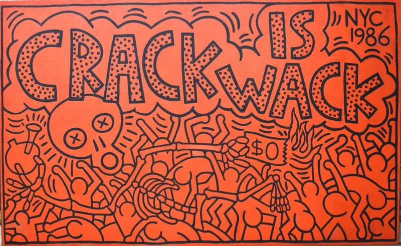 해링은 이 사태에 강하게 반응했다. 그는 허가 없이 맨해튼 할렘강 고속도로 인근의 벽에 이 벽화를 그렸다. 강렬한 오렌지 배경 위에 “CRACK IS WACK”이라는 문구와 함께 해링 특유의 단순하고 상징적인 형상들이 빠른 리듬감으로 배치되어 있다. 도약하는 인물들, 짖는 개, 뒤엉킨 손들. 이 모든 형상은 ‘중독의 혼란’과 ‘생존의 본능’을 동시에 암시한다.