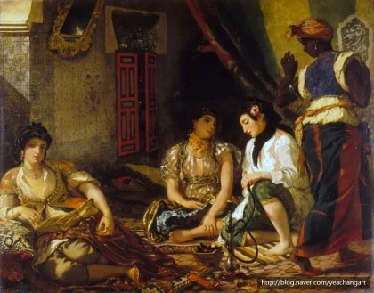 북아프리카 알제리 하렘의 여인들을 그린 이 작품에서 들라크루와는 이국적 소재와 색채 실험을 결합했다. 그는 동양적 장면을 관찰하며, 인간의 섬세한 감정과 사회적 맥락을 화폭에 담았다.