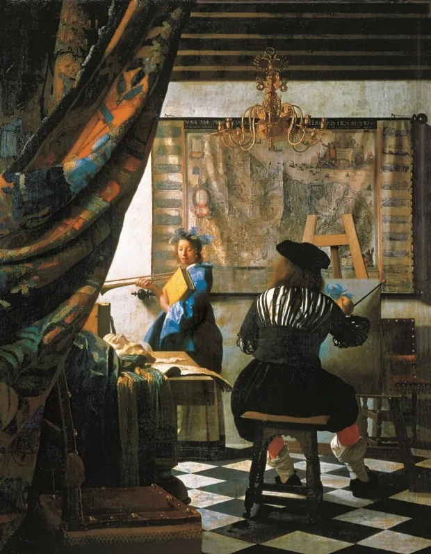〈화가의 아틀리에〉는 베르메르가 남긴 가장 수수께끼 같은 작품이다. 커튼을 걷은 공간 안에서 한 화가가 그림을 그리고 있다. 모델은 로렐 화관을 쓴 여신, 즉 ‘역사’를 상징한다.