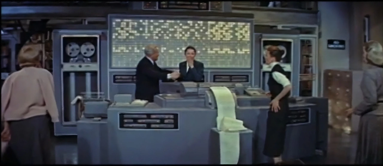 하지만 이 영화를 켜는 순간, 우리는 단순한 남녀의 밀고 당기기를 넘어 시대를 훌쩍 뛰어넘는 놀라운 장면과 마주하게 됩니다. 화면 속 주인공들 사이에서 웅장하고 위압적으로 빛을 깜빡이는 FEMAC이라는 이름의 거대한 컴퓨터가 그 진짜 주인공이니까요.