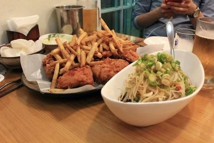 치킨 후라이드와 숙주 샐러드의 조합은 “미쳤다”는 말이 어울릴 정도로 입에 착 감겼다. 치킨을 반쯤 베어 질감이 물씬 나도록 씹다가 중간에 소스가 밴 숙주와 양파를 곁들여 그 둘의 조합을 입안 이리저리 오물거리며 먹는 맛은 역대 최고라고 해도 과언이 아니었다.
