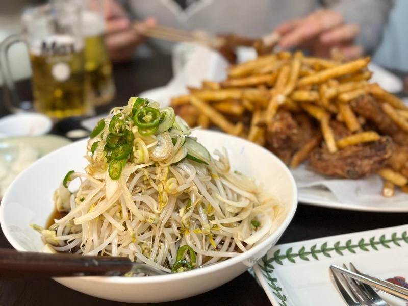 따로 떼어놓고 보면 이렇다 할 게 없다. 한쪽은 많이 보던 그 후라이드치킨이고 다른 쪽이라고 해봐야 양념을 가미한 데친 숙주일 뿐이었다. 주인장의 능력이라면 그 둘의 조합을 찾아낸 것이 전부인데, 급기야 그 조합에 피바람이 불고야 말았다.