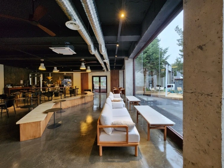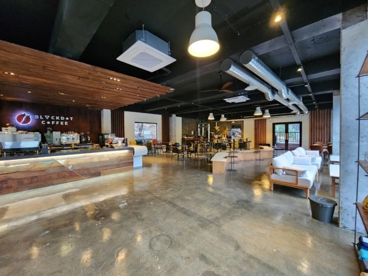 건물은 단층입니다. 7,8미터 길이의 통창 6개가 가로로 길게 늘어서 시각적으로 시원한 인상을 주고 실내 또한 층고를 높게해 개운한 느낌을 한껏 강조한 점이 특징적입니다. 비정형적으로 구획한 실내 곳곳에다양한 형식의 테이블과 의자를 자유분방하게 배치한 것도 개방감을 극대화하려는 주인장의 의도와 합치하겠지요. 편안한 실내에서 엄격히 관리된 음식을 즐길 수 있는 곳이 사실 많지 않습니다. 특히나 품질과 시설에 자부심을 가진 주인장을 만나기가 하늘의 별따기만큼 어려운 것이 현실입니다. 블랙돗트 주인장의 야심 찬 스페셜티가 오래 사랑받았으면 좋겠습니다. 주변 카페와 비교할 때 방문 손님이 적고 전망 또한 많이 아쉬운 점, 참고하시기 바랍니다.