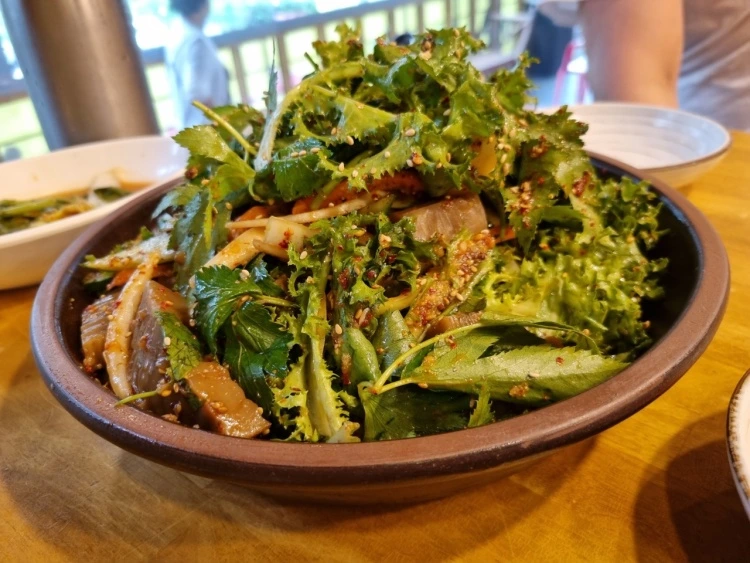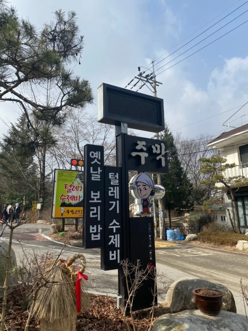 문제의 털레기 수제비는 된장을 적당히 푼 물에 마른 새우와 애호박 등속의 채소를 넣어 국물맛을 냈습니다. 걸쭉한 국물로 감칠맛을 한껏 끌어올린 수제비는 쫄깃한 식감이 돋보였고 곁들인 열무김치, 깍두기, 해초와 잘 어울렸습니다. 털레기는 황해도 전통 음식으로 재료 이것저것을 탈탈 털어 넣은 수제비입니다. 복잡다단한 유원지에 아낌없이 재료를 넣고 정성 들여 끓인 한 끼 식사를 비싸지 않은 가격에 제공하는 식당이 있다는 것은 고마운 일입니다. 식당 내부와 제공되는 음식이 깨끗하게 관리되고 있다면 다 말할 나위가 없습니다. 그 점에서 전 이곳 <주막 보리밥>을 높이 평가합니다.
