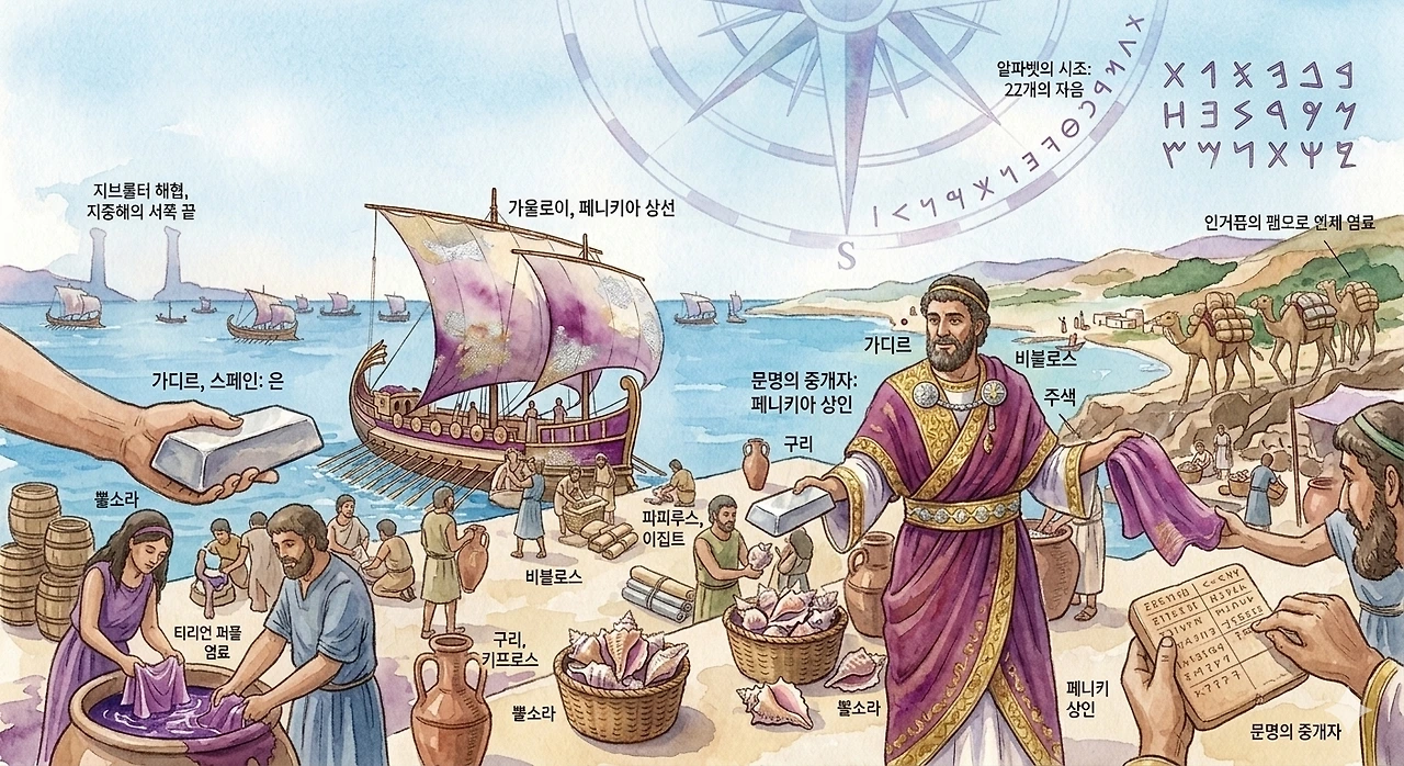 지중해의 아침은 언제나 눈부신 파란색으로 시작되지만, 고대 세계의 진정한 주권은 그 푸른 물결 아래서 건져 올린 '자주색'에 있었다. 기원전 1200년경, 오늘날의 레바논 해안가에 뿌리를 내린 페니키아인들은 땅의 한계를 바다의 기회로 바꾼 민족이었다. 그들은 칼과 창 대신 회계 장부와 항해술을 들고 지중해라는 거대한 ‘푸른 감옥’의 문을 열어젖혔다. 그들의 항로를 따라 흐른 것은 군대의 진격이 아니라, 지중해 전역을 하나의 거대한 시장으로 묶어버린 자본의 혈류였다.