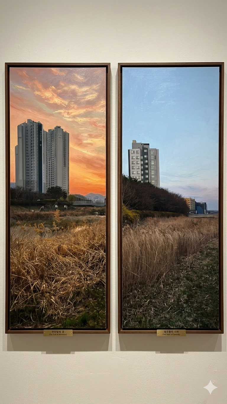 우리의 삶도 이 두 장의 사진과 닮아 있습니다. 때로는 노을처럼 세상의 중심에서 화려하게 빛나고 주목받고 싶어 하지만, 정작 우리를 지탱해 주는 것은 노을 반대편의 고요한 일상입니다. 화려한 성취 뒤에 가려진 묵묵한 노력들, 떠들썩한 만남 뒤에 찾아오는 혼자만의 정적인 시간들. 노을이 주는 감동이 '설렘'이라면, 그 반대편이 주는 편안함은 '안도'에 가깝습니다.